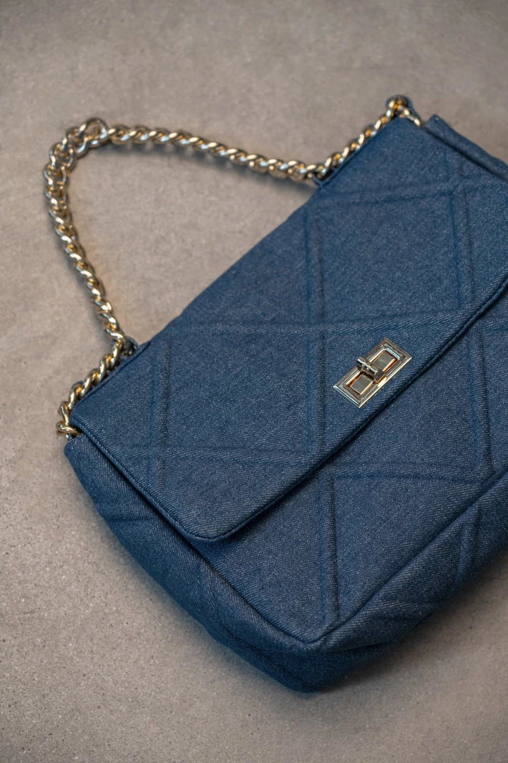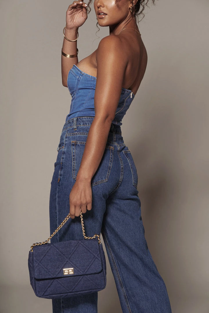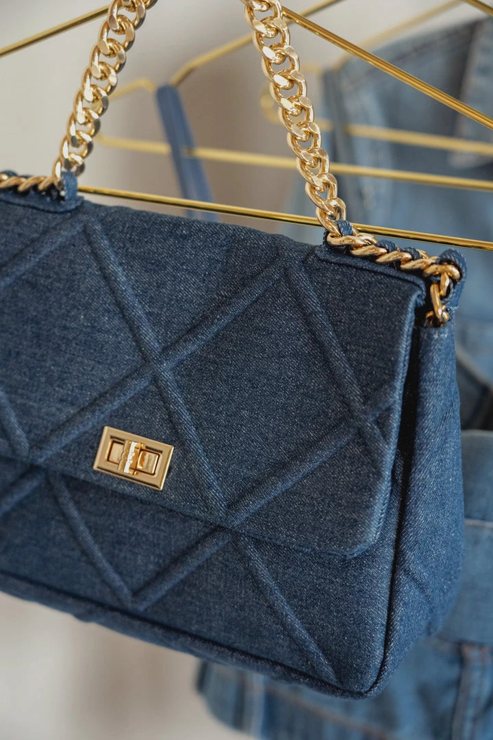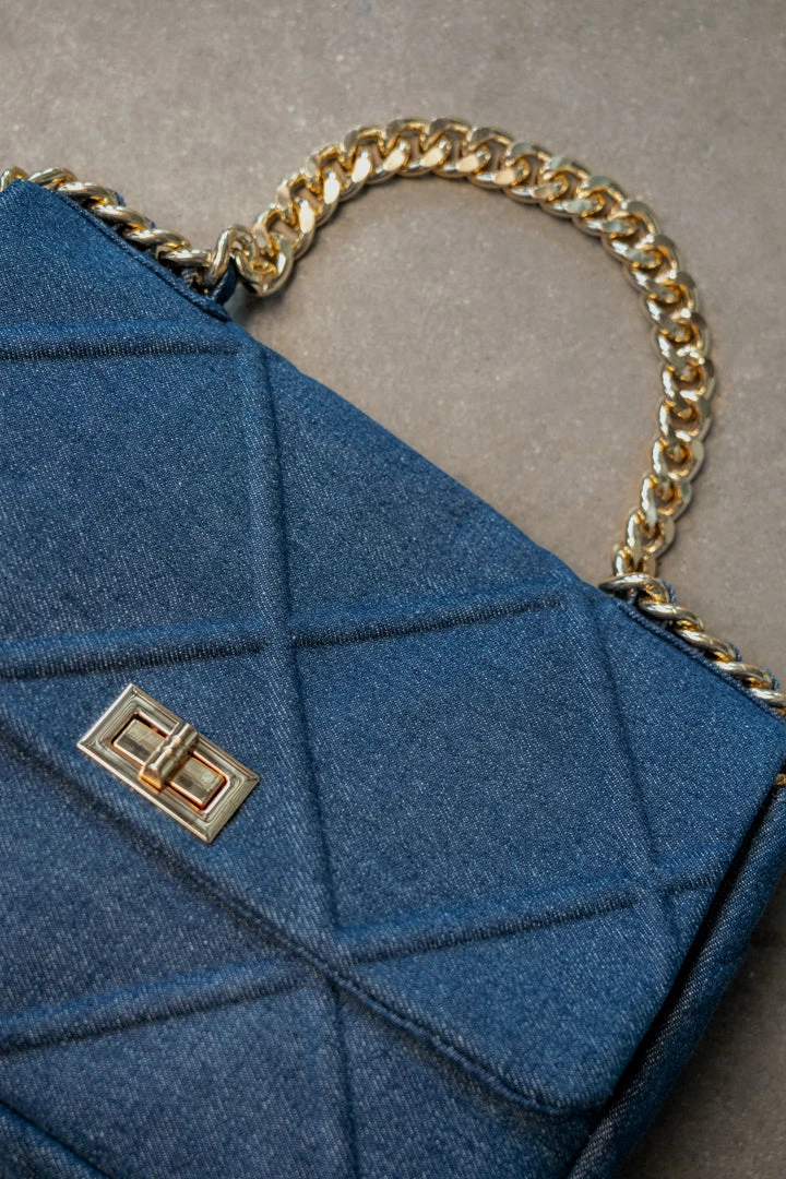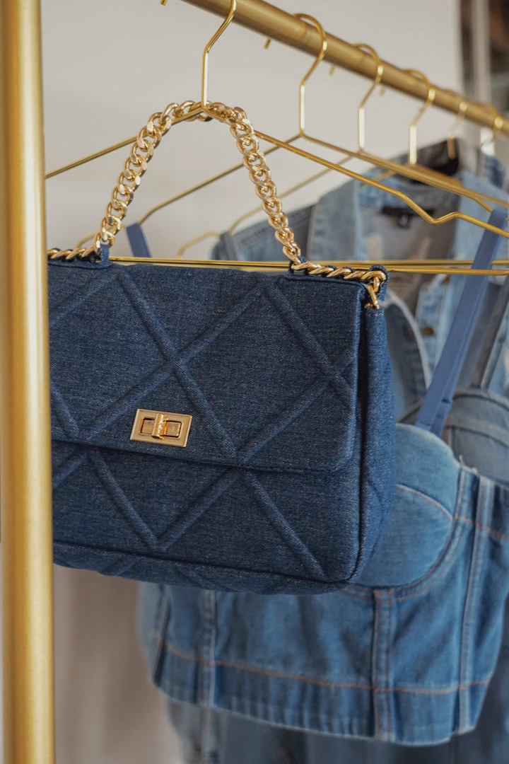 Take your purse game to a new level with our DENIM UPTOWN GOLD CHAIN HANDBAG. This charming handbag features a quilted denim pattern detail, a functional interior zipper pocket, and a flap over top with goldtone turn lock closure. Complete with a gold tone chain handle, and a removable gold tone crossbody chain strap braided with matching denim like fabric for a chic finish! Gold hardware.