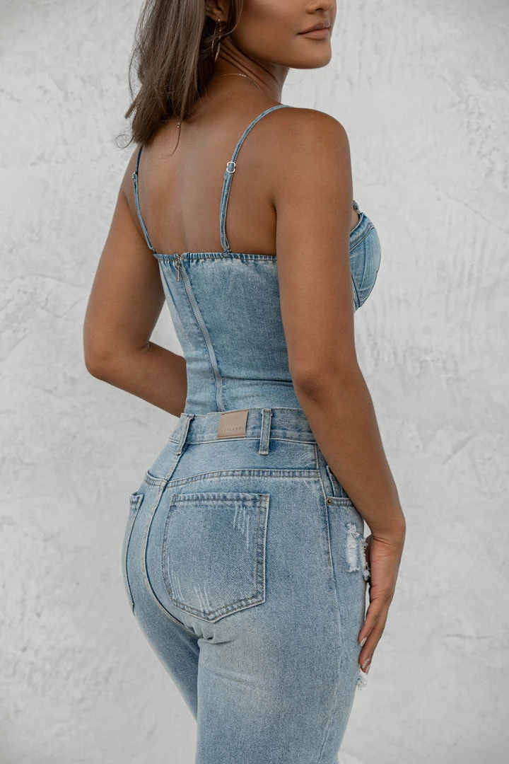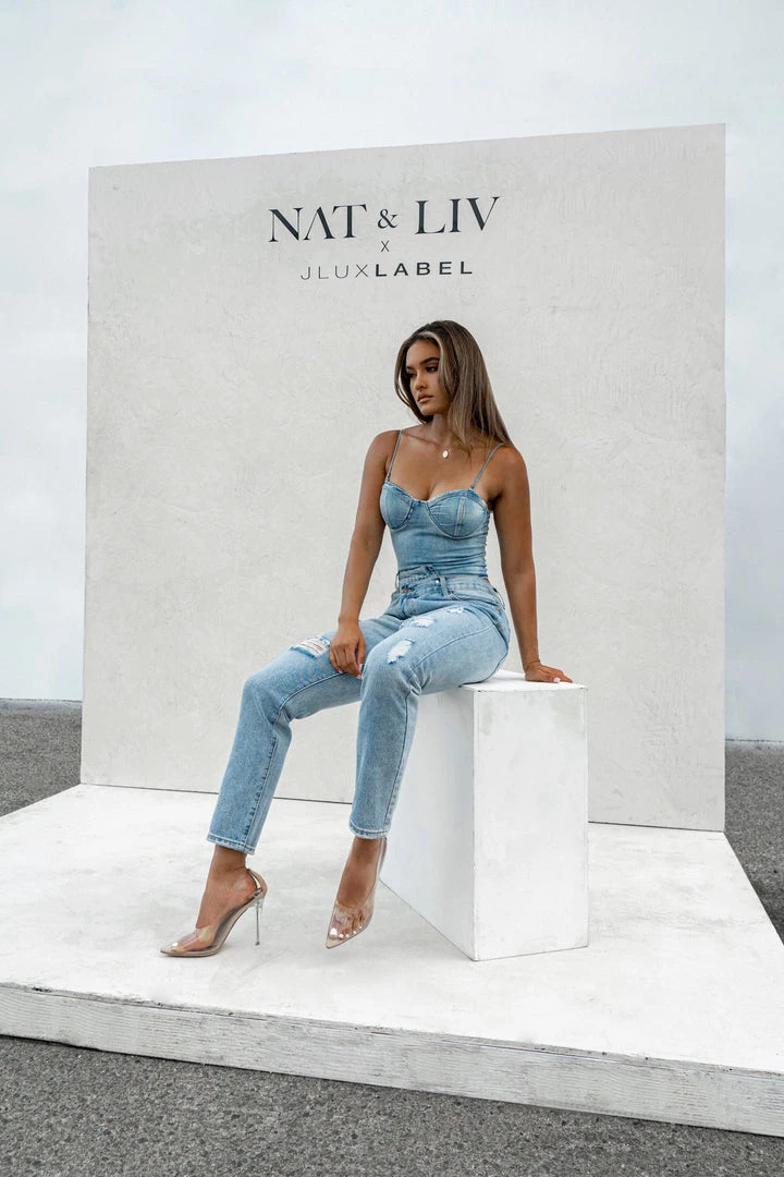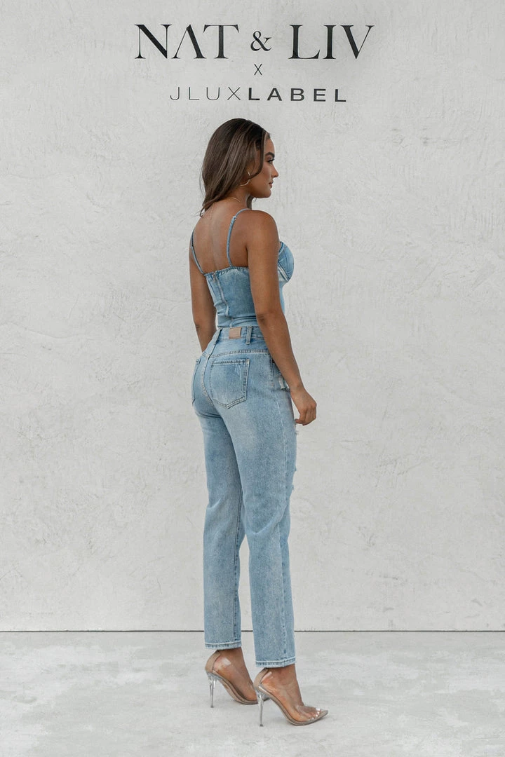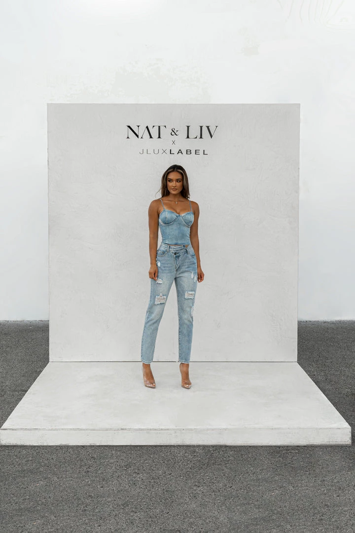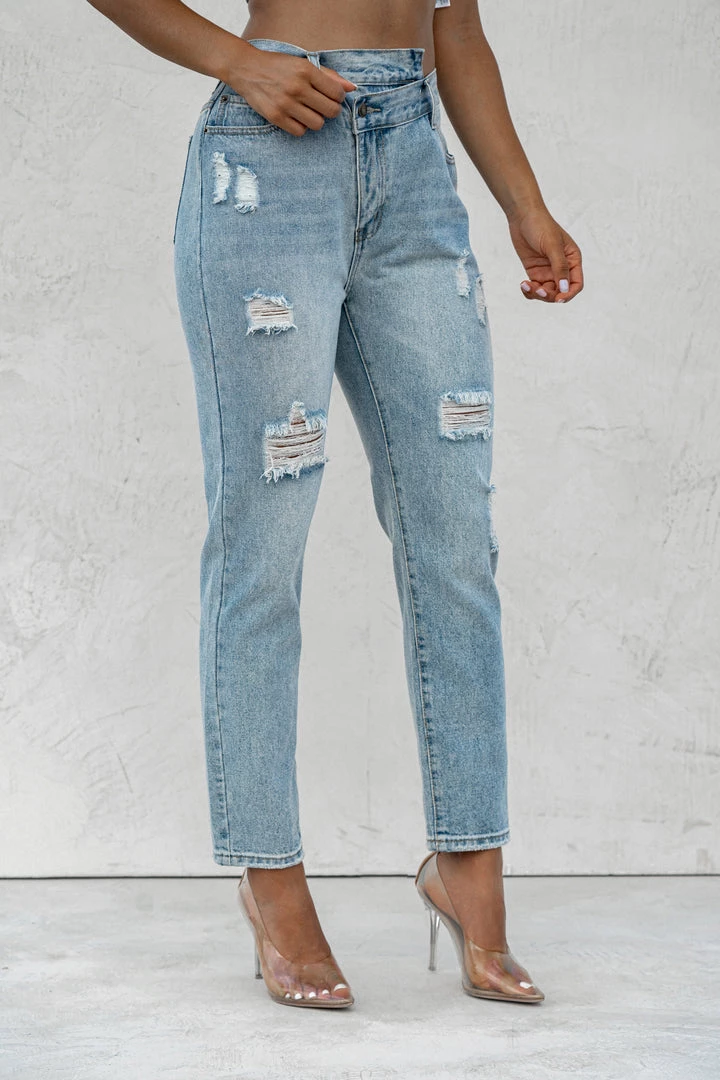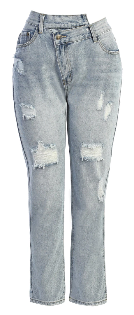 EXCLUSIVELY DESIGNED BY NAT & LIV FOR JLUXLABEL. We got you covered all season in our new CASSIS CROSSOVER ASYMMETRIC JEANS. These edgy pair of denim jeans showcase a trendy asymmetric front zipper with off-center button closure, belt loops, two functional side pockets, and two functional back pockets. Relaxed, tapered pant legs feature distressing details for a chic finish! Pair with our ANGELINA DENIM BUSTIER for a complete look. No stretch. Front coin pocket.