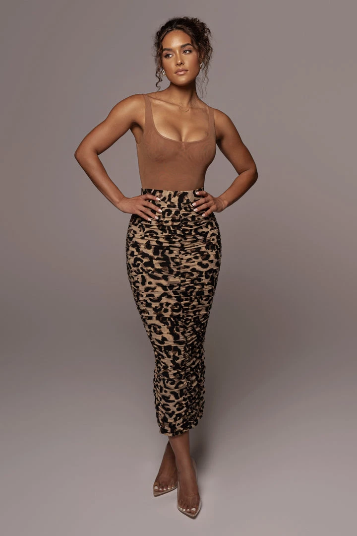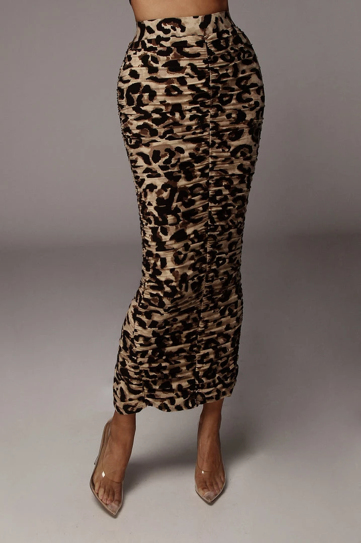 EXCLUSIVELY DESIGNED BY US FOR YOU! A skirt in form of printed perfection is our LEOPARD HALOW RUCHED SKIRT! A stretchy maxi length skirt featured in an alluring leopard print, topped with an elastic waistband, ruching detail throughout, and a small lower back slit for a finishing touch. Constructed in our smooth double lined material, this showstopper is the perfect blend of comfy and trendy! Stretchy.