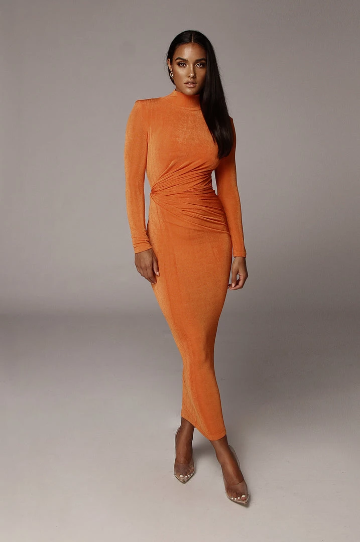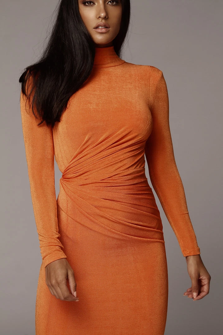 EXCLUSIVELY DESIGNED BY US FOR YOU. Steal the show in our ORANGE KARA MOCK NECK DRESS! Curated in our signature slinky fabric, this luxurious midi dress features a high neckline with long sleeves, shoulder padding, and gorgeous gathering detail at the waist for a stylish touch. Pair with our GLASS DOLL CLEAR PUMPS for a complete look. Double button neck back closure. Stretchy. Double lined.
