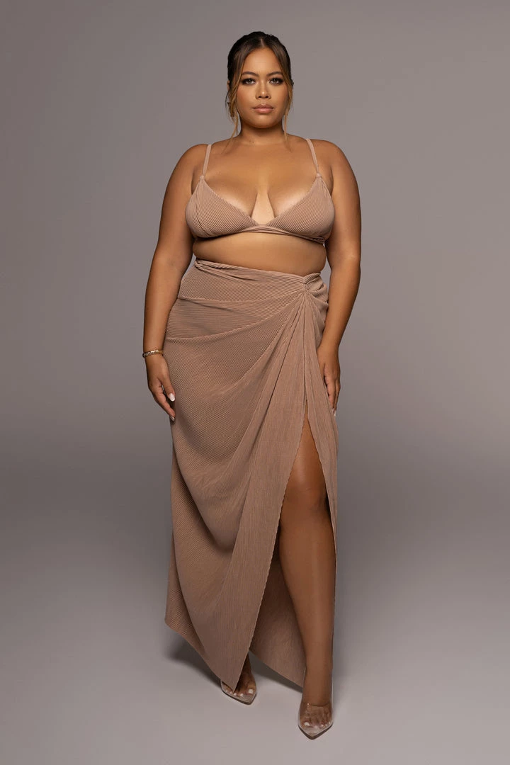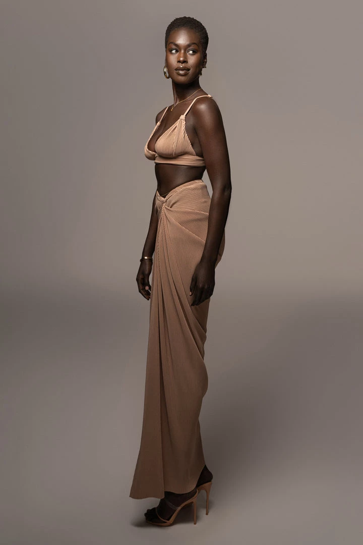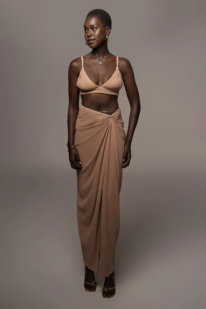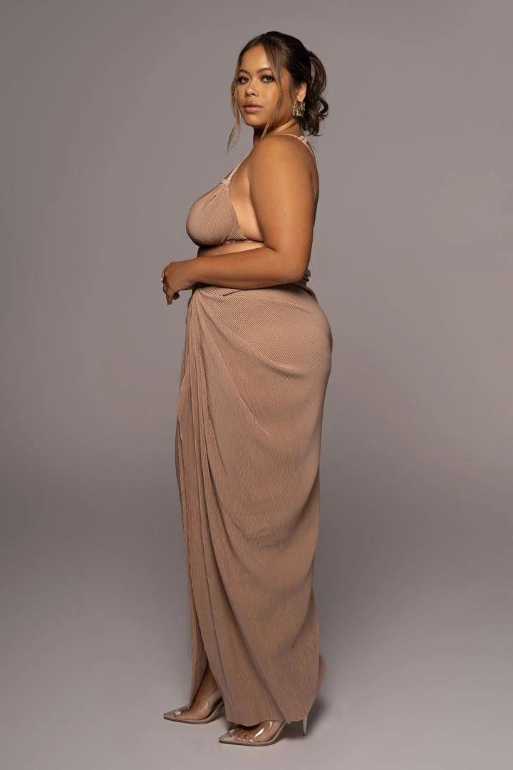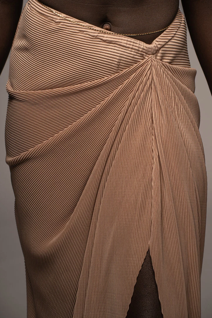EXCLUSIVELY DESIGNED BY US FOR YOU. Stun your way into sunnier days with our BEIGE ATHENA DRAPED SKIRT. This luxurious maxi skirt is crafted from a pleated chiffon fabric featuring a beautiful drape design with a slit on one side. Pair with the GOING STEADY BRALETTE TOP for the full look. Stretchy. Elastic waistband.