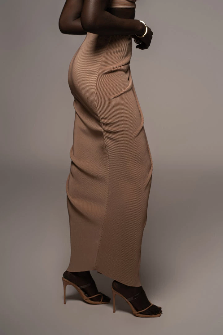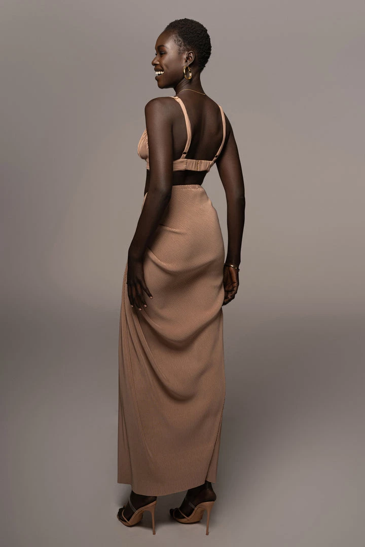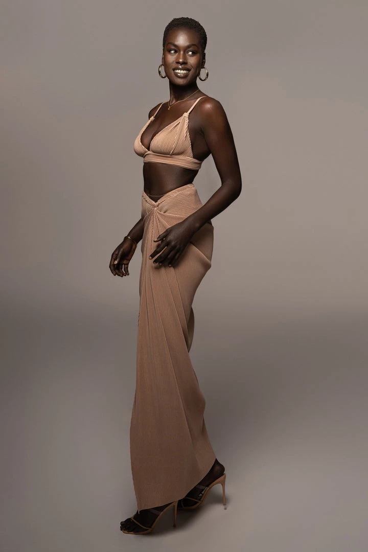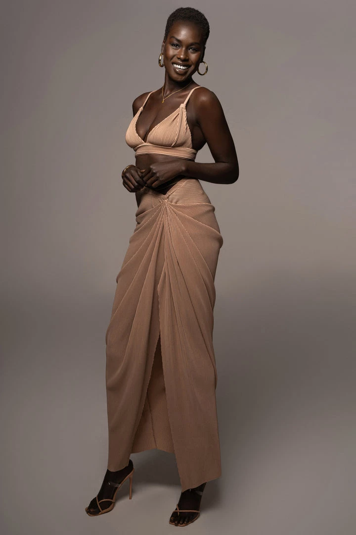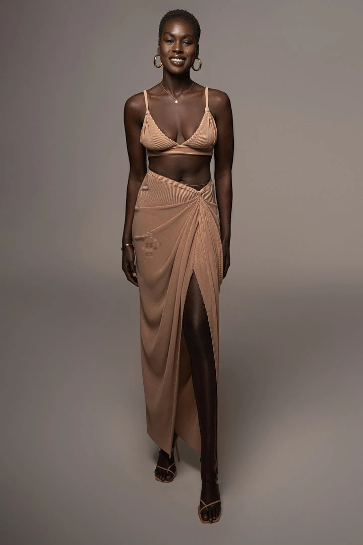EXCLUSIVELY DESIGNED BY US FOR YOU. Stun your way into sunnier days with our BEIGE ATHENA DRAPED SKIRT. This luxurious maxi skirt is crafted from a pleated chiffon fabric featuring a beautiful drape design with a slit on one side. Pair with the GOING STEADY BRALETTE TOP for the full look. Stretchy. Elastic waistband.