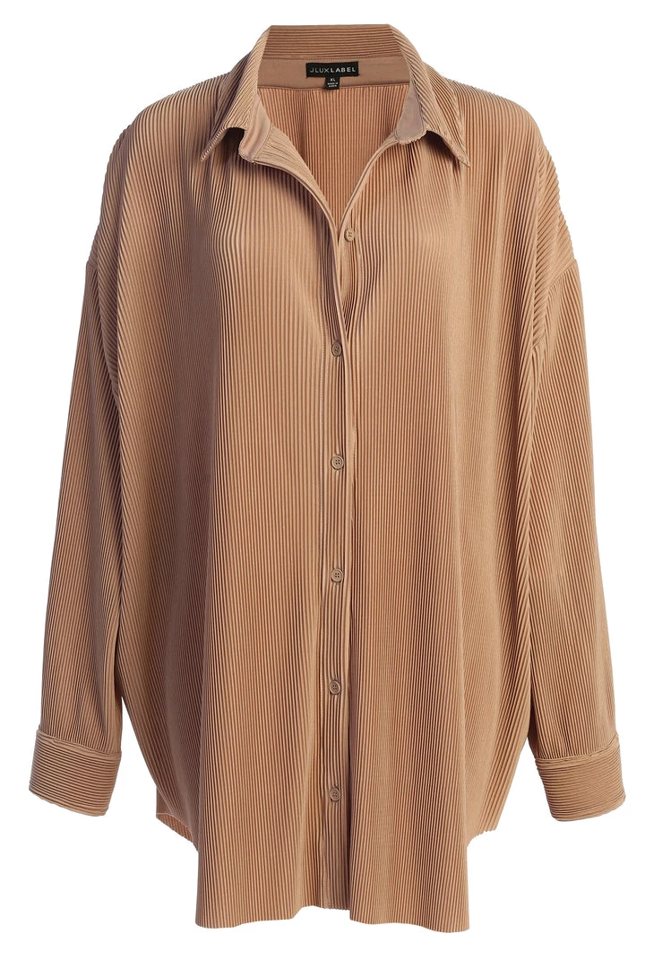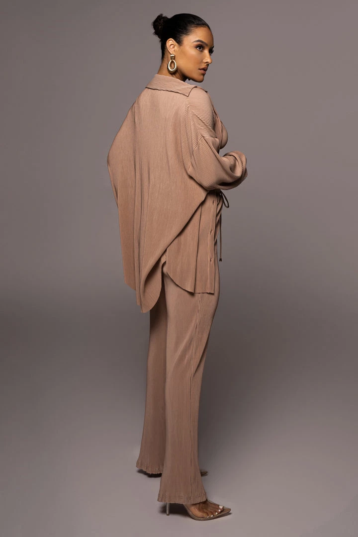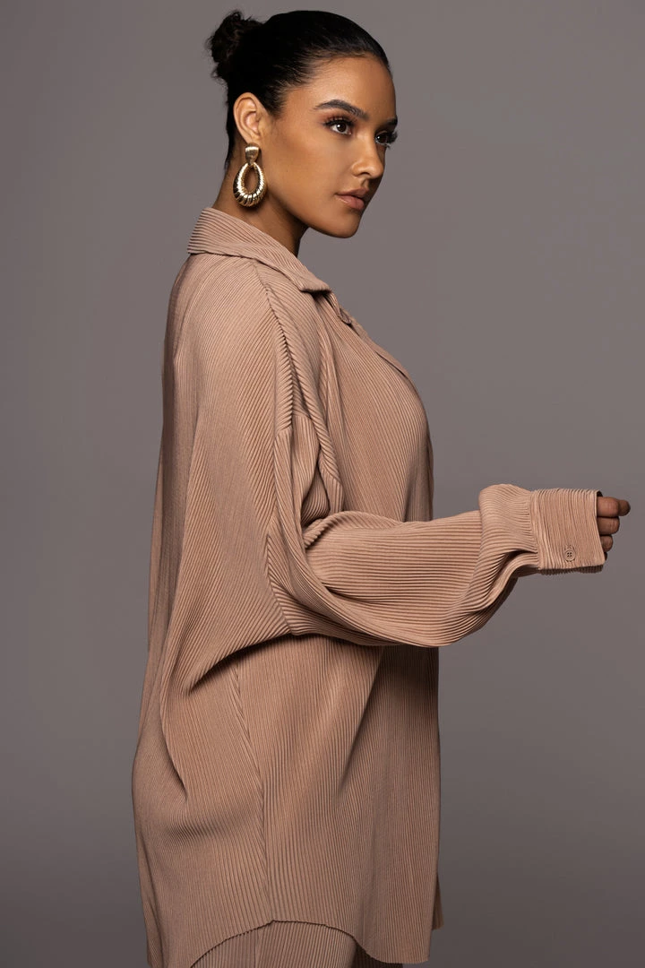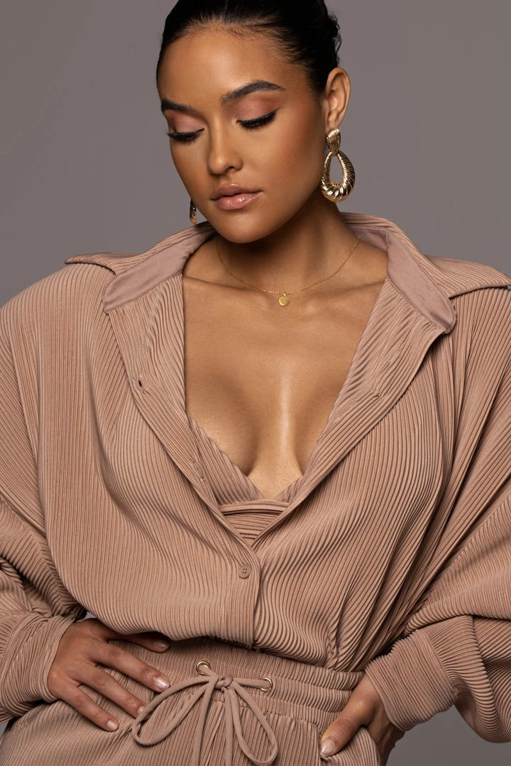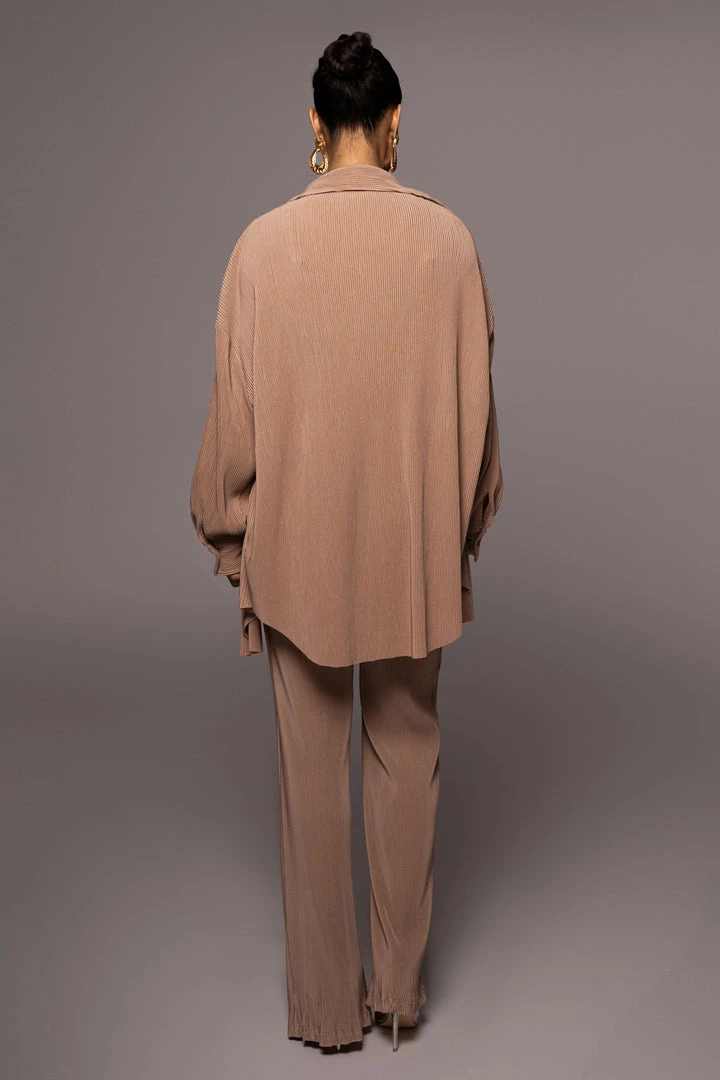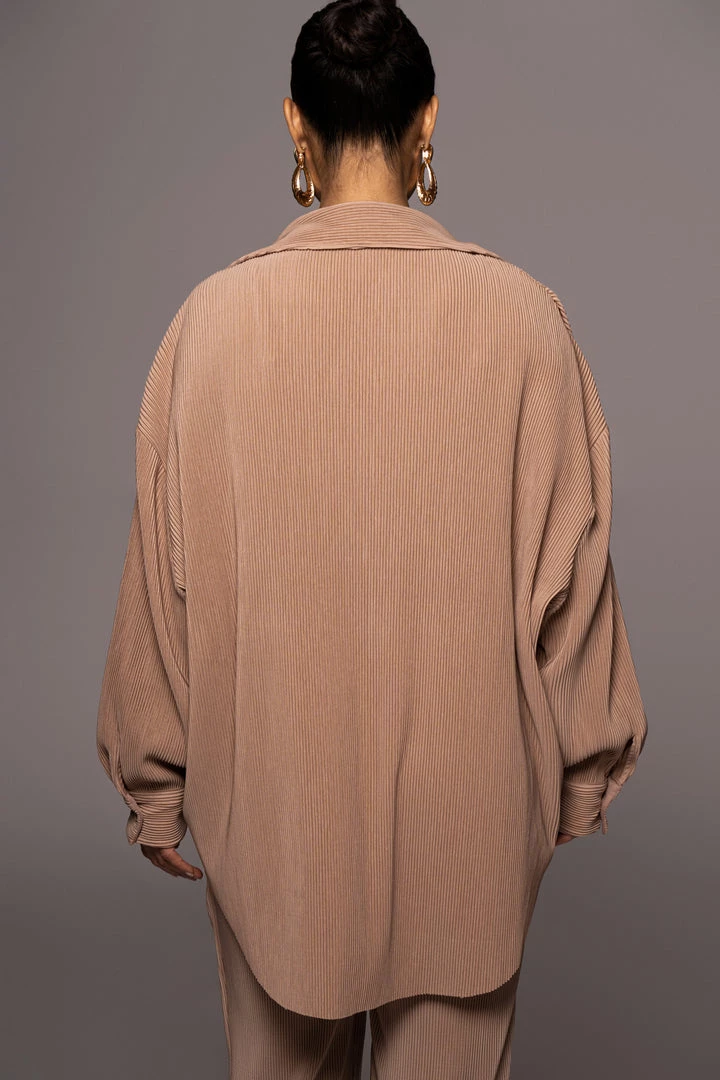 EXCLUSIVELY DESIGNED BY US FOR YOU. Spring suiting never looked better! Reach for our BEIGE DINA BUTTON DOWN TOP for a day full of alluring sophistication. This fully pleated button up top features a collared neck with dropped shoulders, long sleeve arms, and button detailed cuffs for a classy touch. Pair with the GOING STEADY BRALETTE TOP and VERIA DRAWSTRING PANTS for the full look. Oversized. Not sold as set.