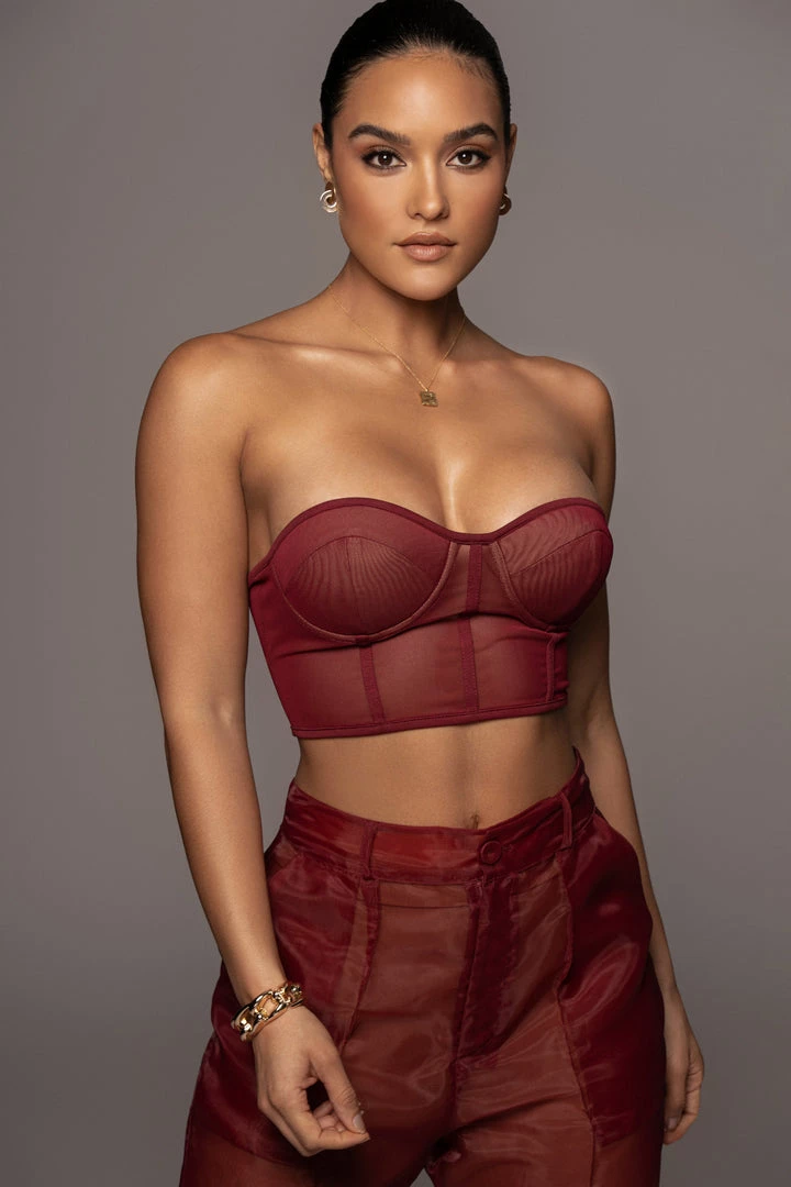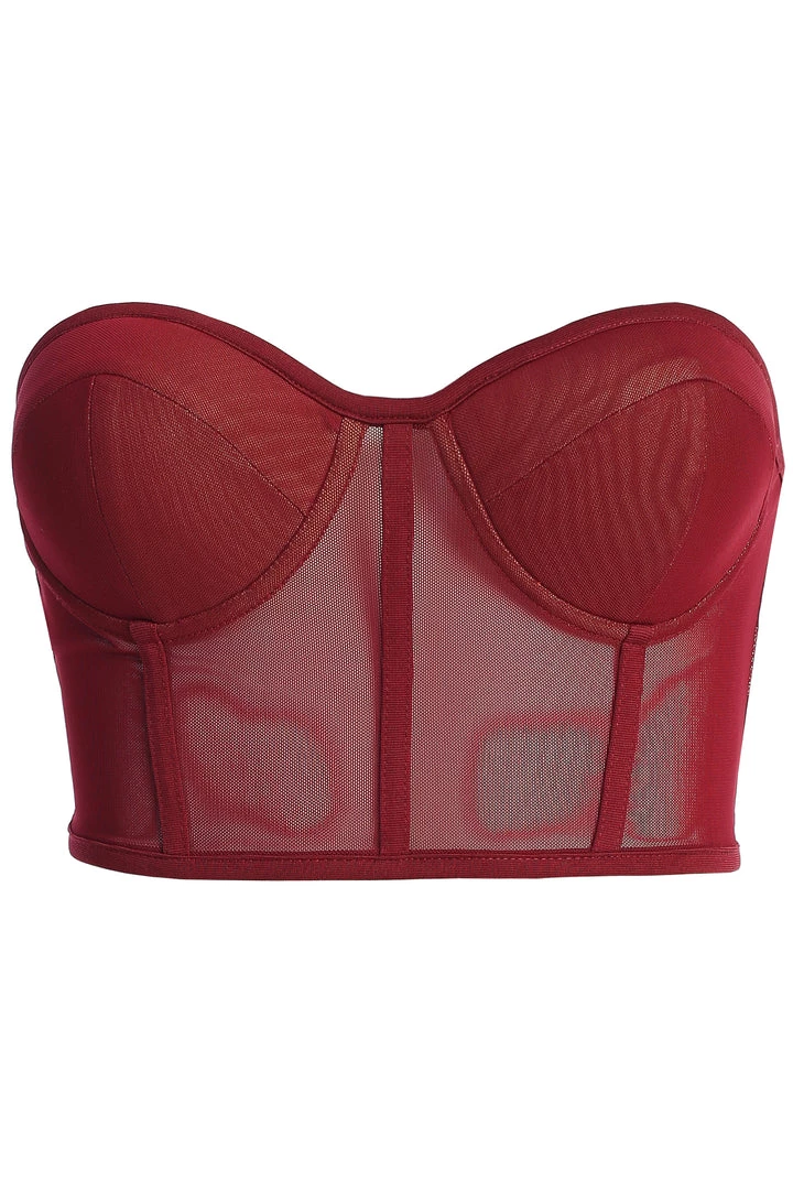 EXCLUSIVELY DESIGNED BY US FOR YOU. Our current corset obsession only gets better with the BERRY SHAYLA BUSTIER! Featuring a strapless design with a sweetheart neckline and padded cups for support. Stunning boned trim detail throughout adds a finishing touch! Crafted in stretchy sheer mesh, this piece is one you can wear with anything. Adjustable hook and eye back for closure. Pair with the JEANNA COAT and LIVY ORGANZA PANTS for the full look. Stretchy.Â