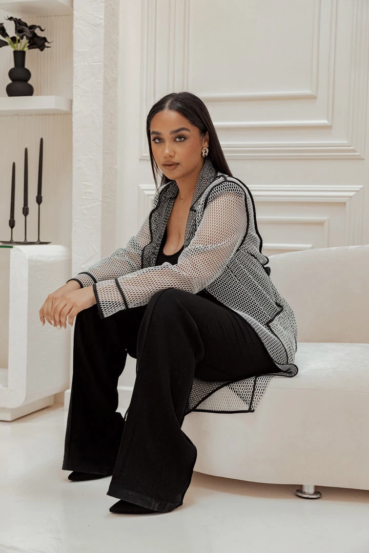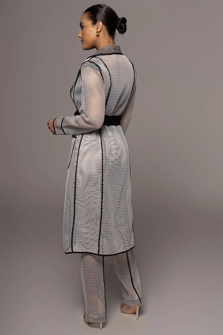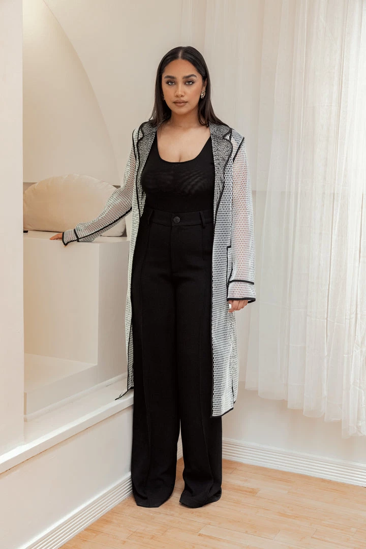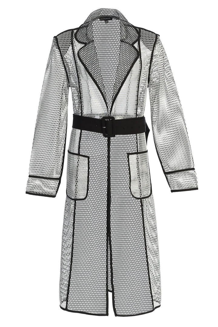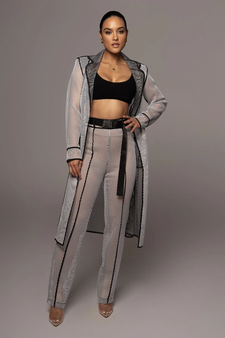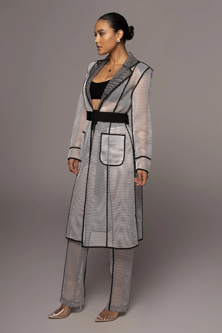 EXCLUSIVELY DESIGNED BY US FOR YOU. What’s not to love about our BLACK BEXLEY COAT. Designed in a knitted mesh, this trend setting coat comes with stylish notch lapels, long sleeve arms, two functional welt pockets, and an open front with matching belt detailing a squared acrylic buckle. Black contrast stitching throughout to finish the look. Pair with the MESH ESSENTIALS TANK BODYSUIT and HASLEY PANTS for the full look. No stretch.