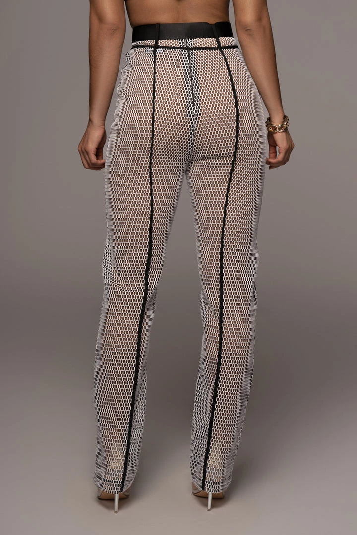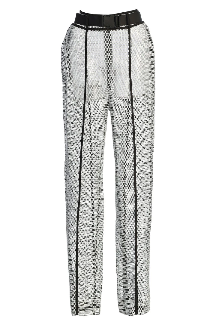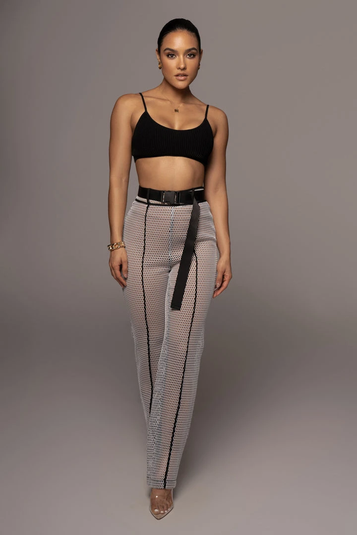 EXCLUSIVELY DESIGNED BY US FOR YOU. Our BLACK HASLEY PANTS were made for all the trendsetters! Designed in a knitted mesh fabric, these stunning high waist bottoms are topped with a trendy clip buckle, front button/zipper closure, and straight leg hems with vertical line detailing down the center front/back. Pair with the MAKANI BRALETTE and BEXLEY COAT for the full look. No stretch.