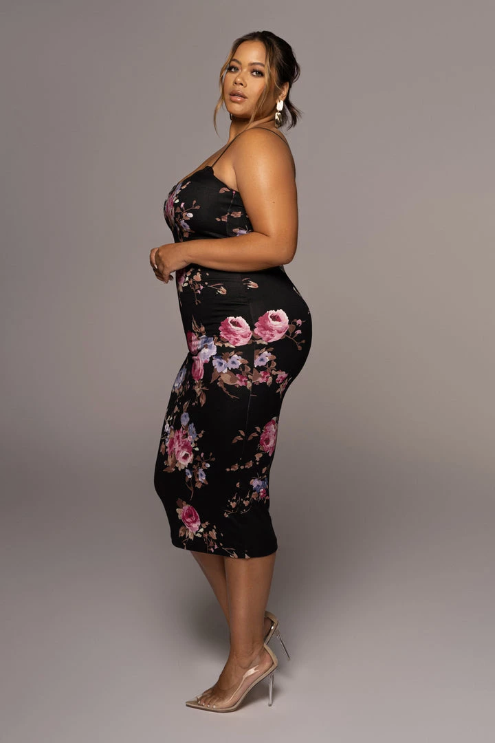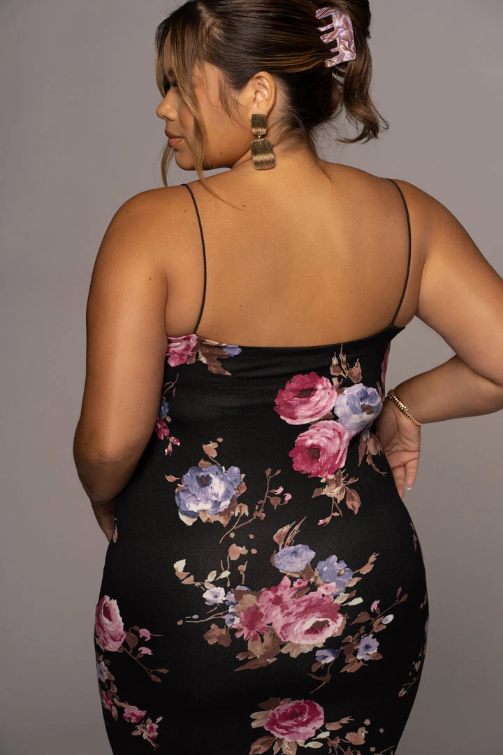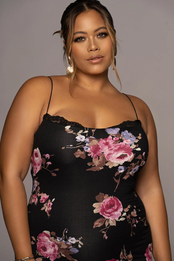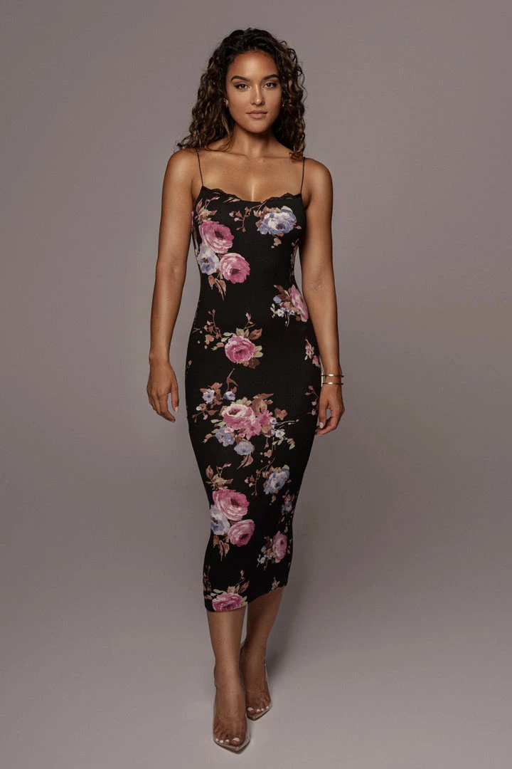 EXCLUSIVELY DESIGNED BY US FOR YOU. Get lost in the vibrant beauty of our BLACK PURPLE FLORAL CASSIA STRAP DRESS. We have taken our best seller, the HINT OF LACE MIDI DRESS, and renewed it with a dreamy floral pattern for a femme touch. Crafted in our soft double lined fabric, this smooth dress highlights a round neckline with lace at the bust and thin cord shoulder straps for a stylish touch. Midi length hem. Stretchy.