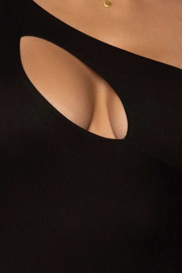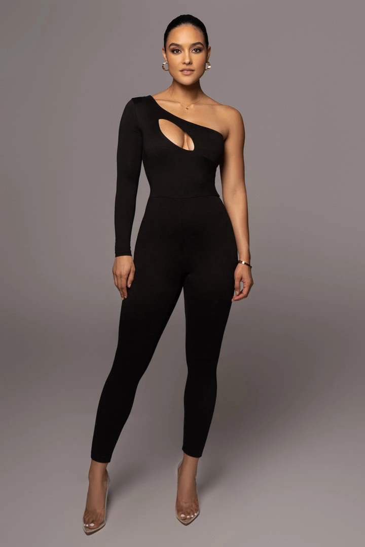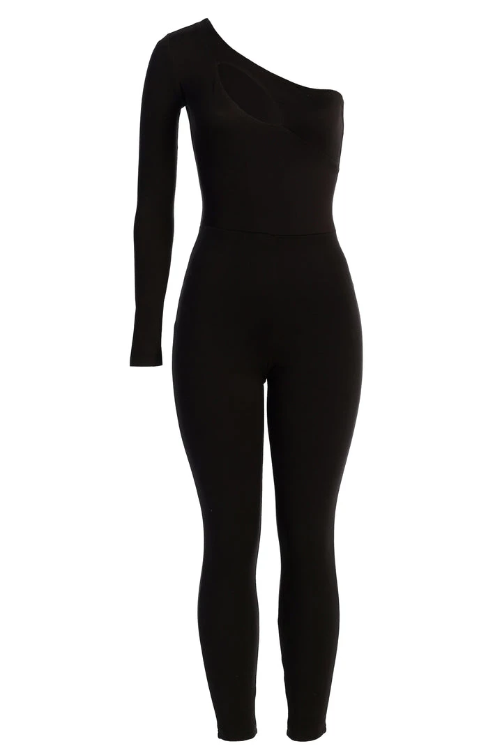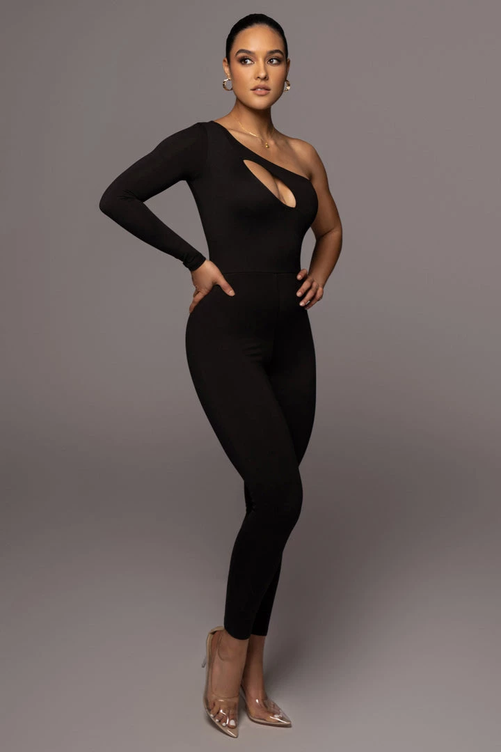 EXCLUSIVELY DESIGNED BY US FOR YOU. Go for a bolder look this season in our BLACK SAIKA KEYHOLE JUMPSUIT! Smooth and soft to the touch, our newest jumpsuit features a one shoulder design with a daring keyhole cutout at the chest and skinny leg hems. Designed in a double lined fabric for contouring support and comfort. Stretchy.