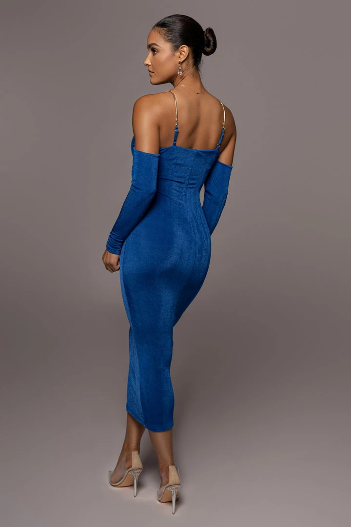 EXCLUSIVELY DESIGNED BY US FOR YOU. Find the one in our BLUE ALL EYES ON YOU DRESS. This flattering knee length dress highlights a low v-cut neck with thin gold tone chain straps and dreamy off the shoulder long sleeves with a semi drape to finish the look. Designed in our soft double lined slinky material for perfection. Stretchy.
