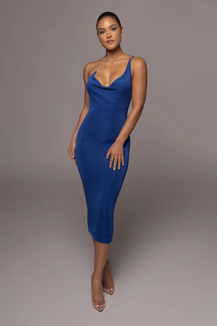 EXCLUSIVELY DESIGNED BY US FOR YOU. Crafted in our signature double lined slinky fabric, our BLUE MODERN MUSE MINI DRESS defines glam, class, and comfort! Our best seller, the Amarie Rhinestone Dress has been redesigned is an all new version for new elegance! This one shoulder midi dress features a cowl neckline with a thin camisole strap and thin gold tone metal strap that comes complete with a removable lobster claw clasp. The solid strap is not adjustable. Stretchy.