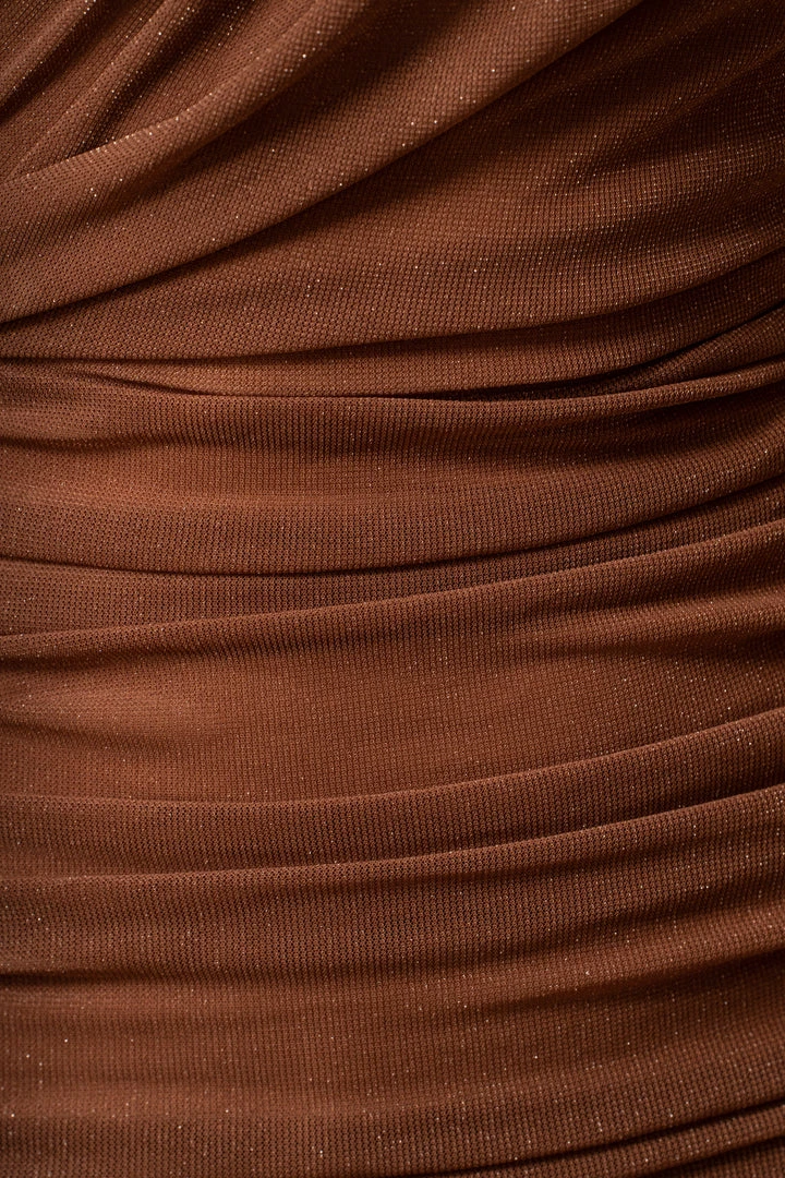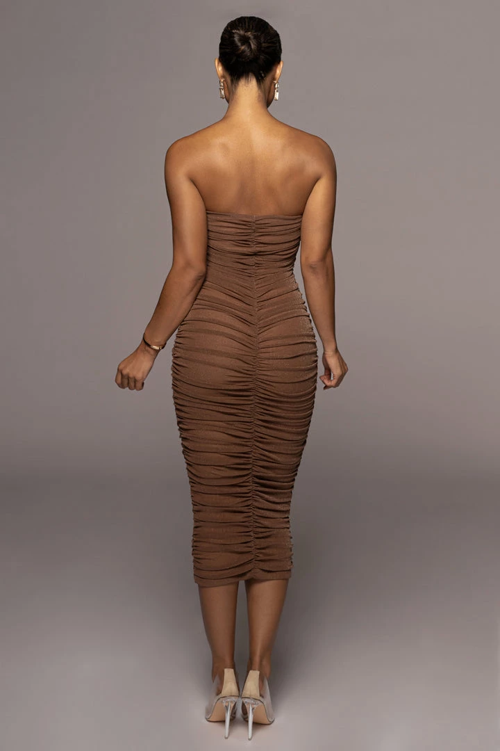 EXCLUSIVELY DESIGNED BY US FOR YOU. Head to toe glamour in the BROWN/SILVER CELESTIA MIDI DRESS. Prepare to turn heads in this shimmery design featuring a strapless neckline and ruching throughout with a figure hugging silhouette that accentuates your waistline. Complete with lined interior and grip silicone gel at the bust for a secure hold. Midi length hem. Stretchy.