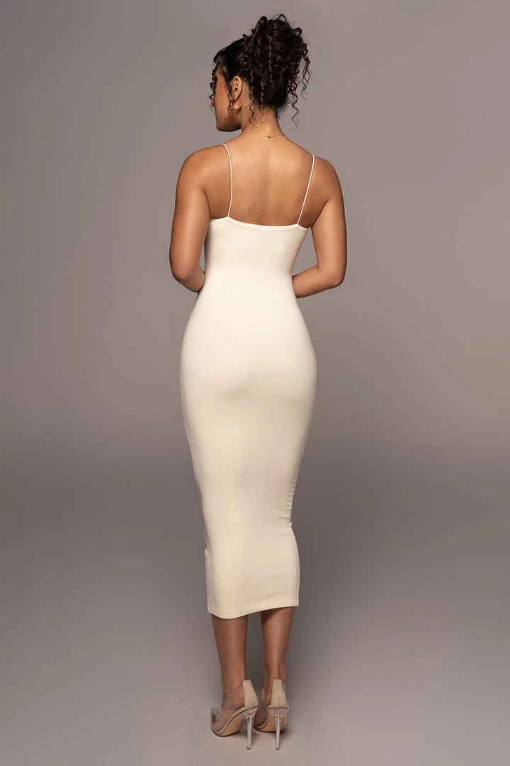 EXCLUSIVELY DESIGNED BY US FOR YOU. The perfect after party look starts with our BUTTERCREAM COLETTE MIDI DRESS! A touch of lace at the bust adds sweet allure to this curve hugging dress with bungee shoulder straps and a midi length hem. Designed in double lined jersey fabric for a smooth and sleek finish. Stretchy.