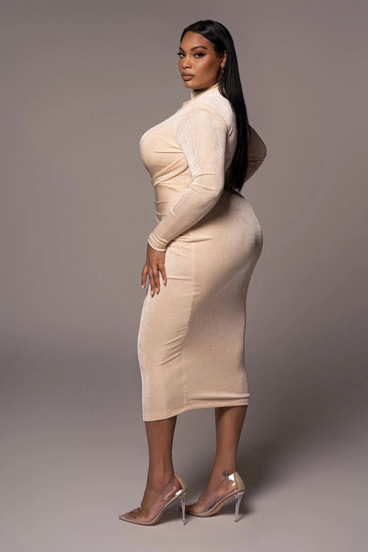 EXCLUSIVELY DESIGNED BY US FOR YOU. Steal the show in our BUTTERCREAM KARA MOCK NECK DRESS! Curated in our signature slinky fabric, this luxurious midi dress features a high neckline with long sleeves, shoulder padding, and gorgeous gathering detail at the waist for a stylish touch. Pair with our GLASS DOLL CLEAR PUMPÂ for a complete look. Double button neck back closure. Stretchy. Double lined.