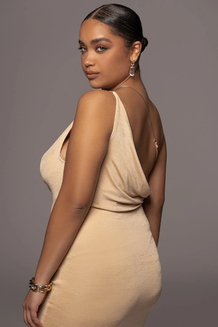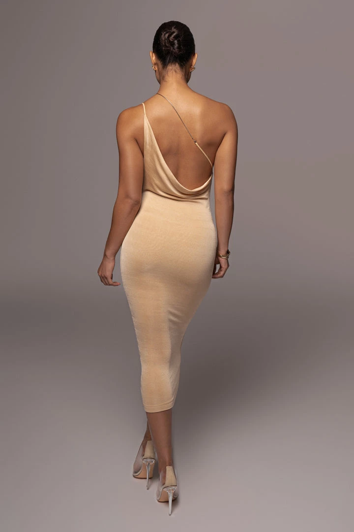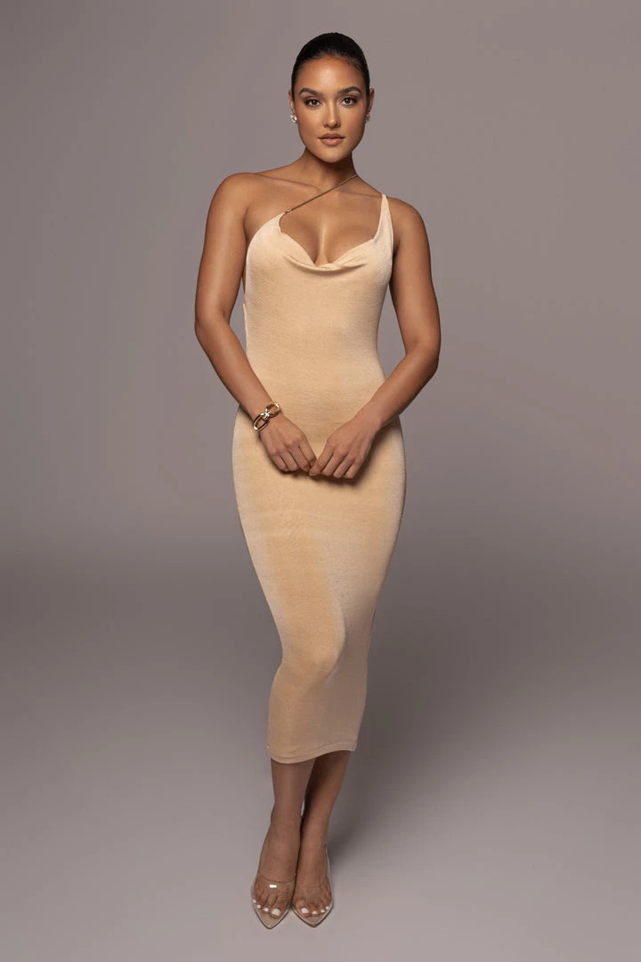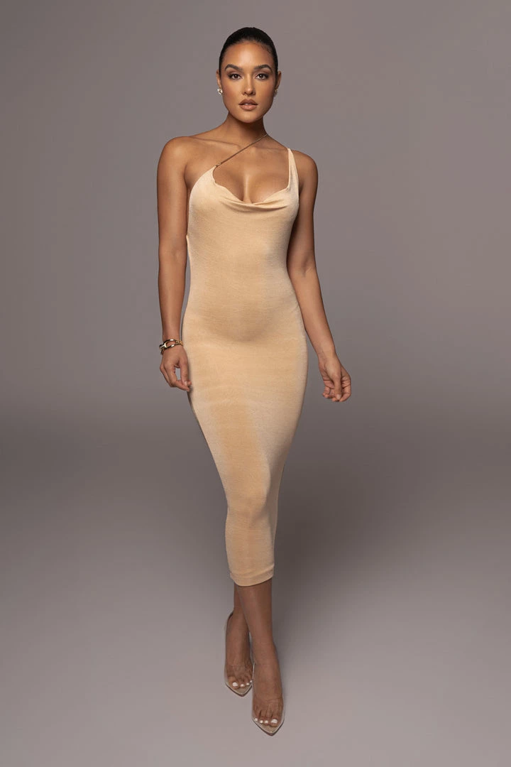 EXCLUSIVELY DESIGNED BY US FOR YOU. Crafted in our signature double lined slinky fabric, our BUTTERCREAM MODERN MUSE MINI DRESS defines glam, class, and comfort! Our best seller, the Amarie Rhinestone Dress has been redesigned is an all new version for new elegance! This one shoulder midi dress features a cowl neckline with a thin camisole strap and thin gold tone metal strap that comes complete with a removable lobster claw clasp. The solid strap is not adjustable. Stretchy.