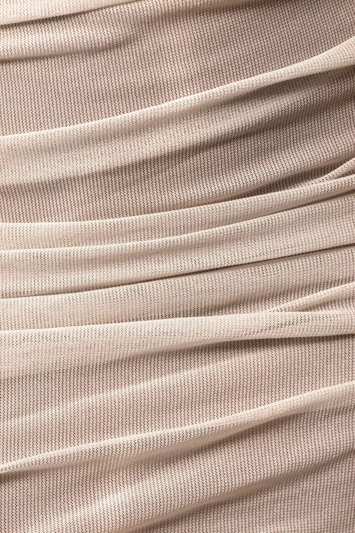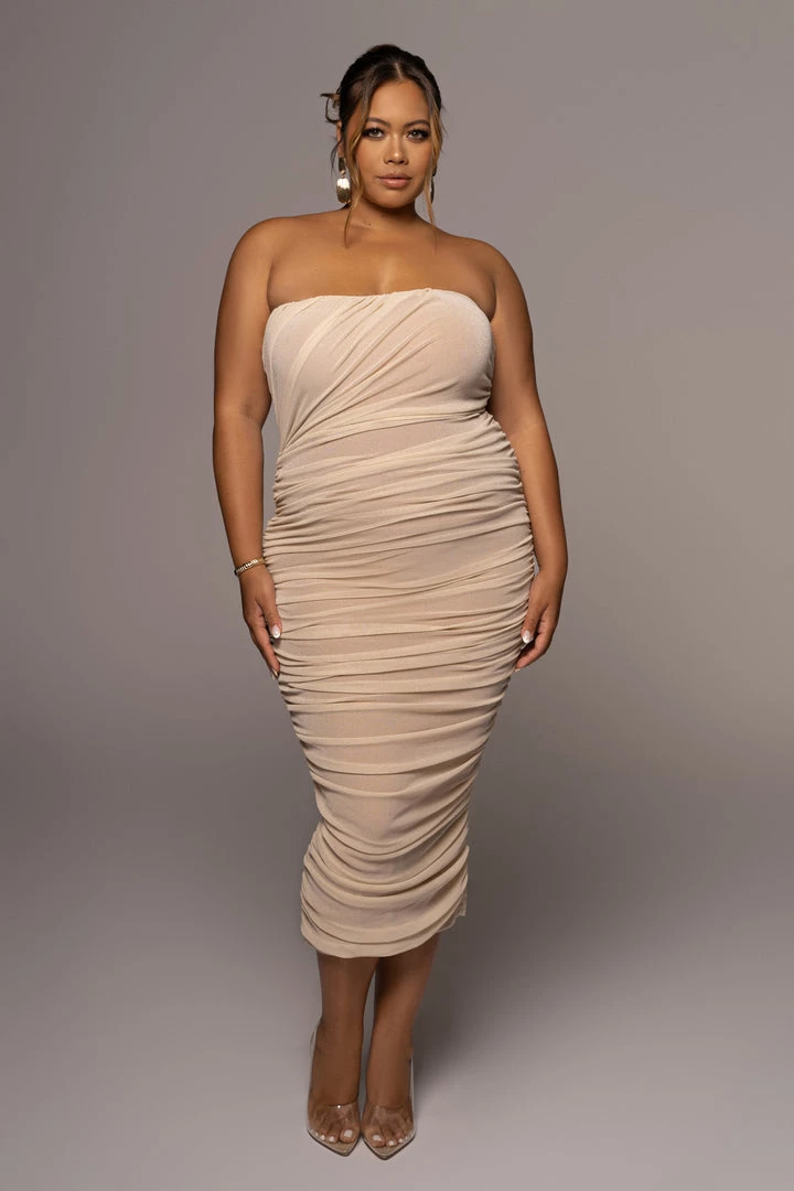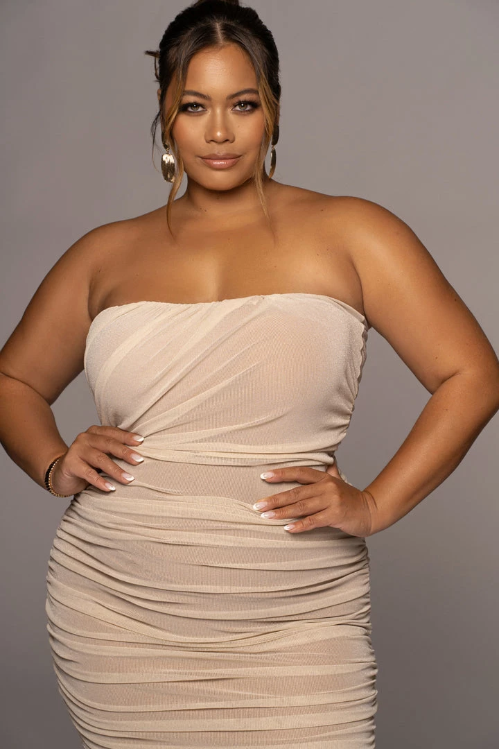 EXCLUSIVELY DESIGNED BY US FOR YOU. Head to toe glamour in the BUTTERCREAM/SILVER CELESTIA MIDI DRESS. Prepare to turn heads in this shimmery design featuring a strapless neckline and ruching throughout with a figure hugging silhouette that accentuates your waistline. Complete with lined interior and grip silicone gel at the bust for a secure hold. Midi length hem. Stretchy.