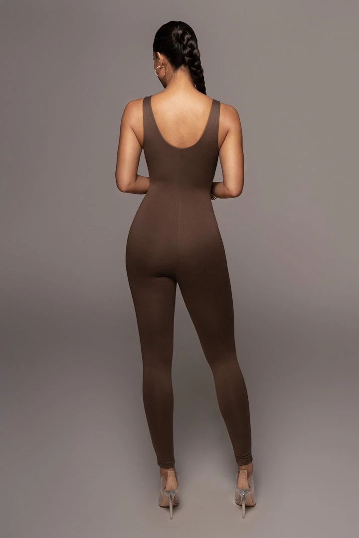 EXCLUSIVELY DESIGNED BY US FOR YOU. All eyes are on you when out in the CHOCOLATE ALO DOUBLE LAYER JUMPSUIT! This versatile, sleeveless jumpsuit features a body forming silhouette with a low scoop neck, tank shoulders, and skinny leg hems. Designed in smooth double lined jersey fabric for compression support. Style it as a layer or by itself, either way, your look will be irresistible! Stretchy.