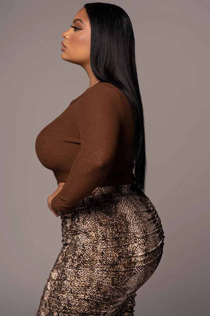 EXCLUSIVELY DESIGNED BY US FOR YOU. Our CHOCOLATE BRITTNEY RIBBED LONG SLEEVE TOP is thermal perfection for layering or lounging! Crafted in a soft lightweight semi-sheer rib knit material with a scoop neckline, long sleeves, and a slim fitting bodice to highlight your curves. Stretchy.Â