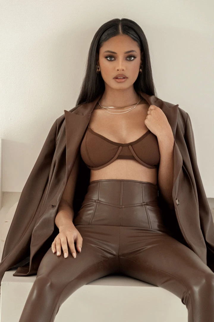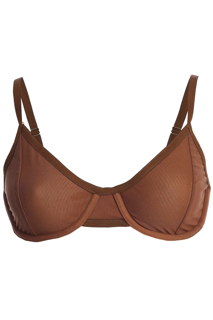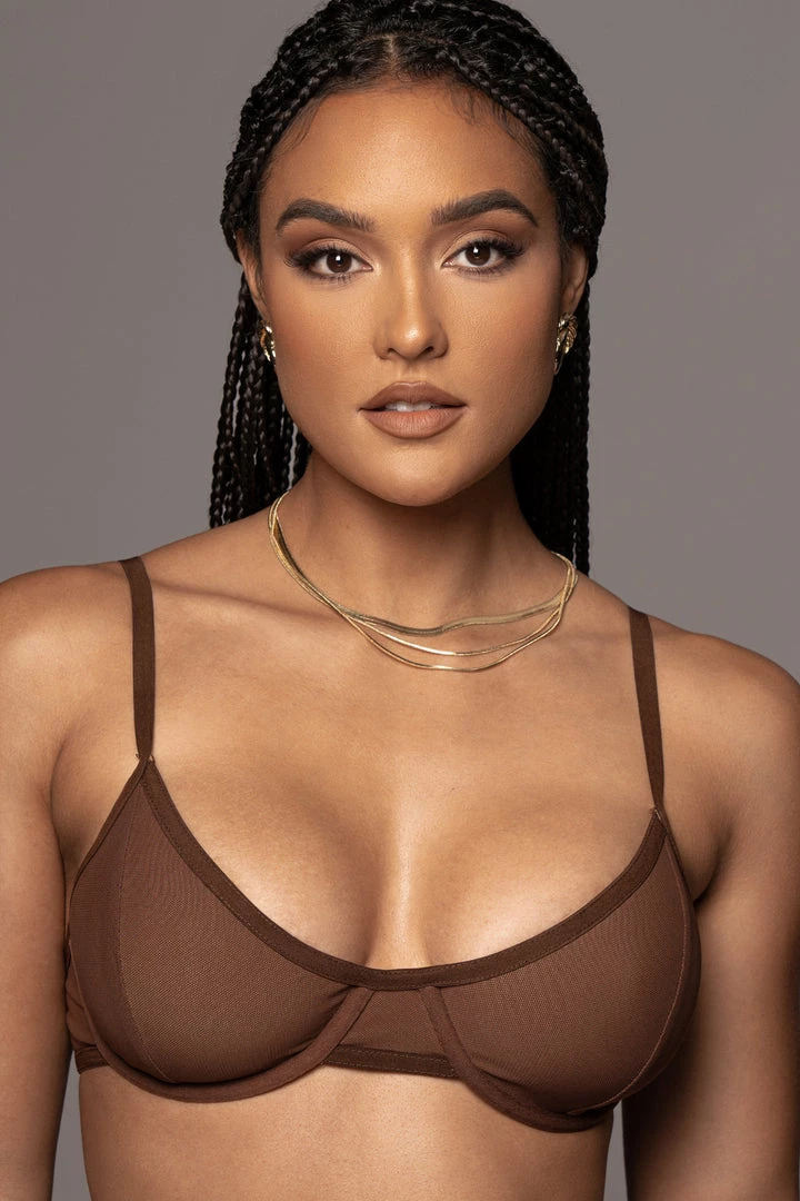 EXCLUSIVELY DESIGNED BY US FOR YOU. Our CHOCOLATE JONI BRALETTE is endlessly versatile! This flirty bralette comes with underwired cups for support, adjustable shoulder straps, and adjustable triple back hook and eye closure. Designed in a mesmerizing sheer mesh fabric, this staple piece takes any look to a polished level. Interior lining for some coverage.