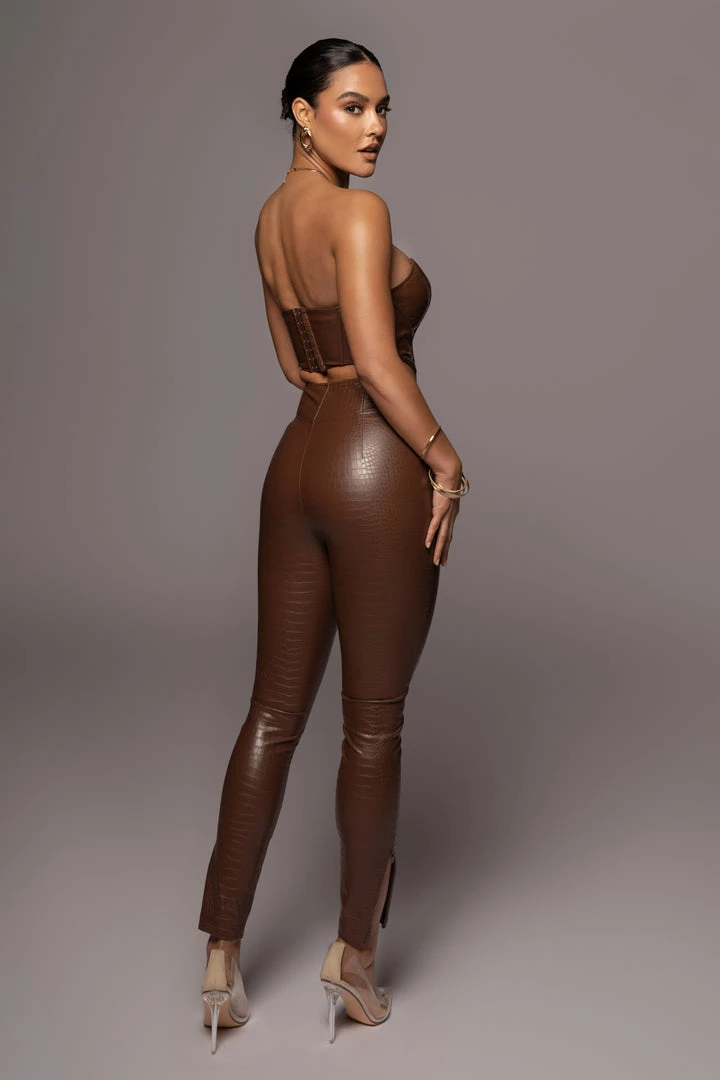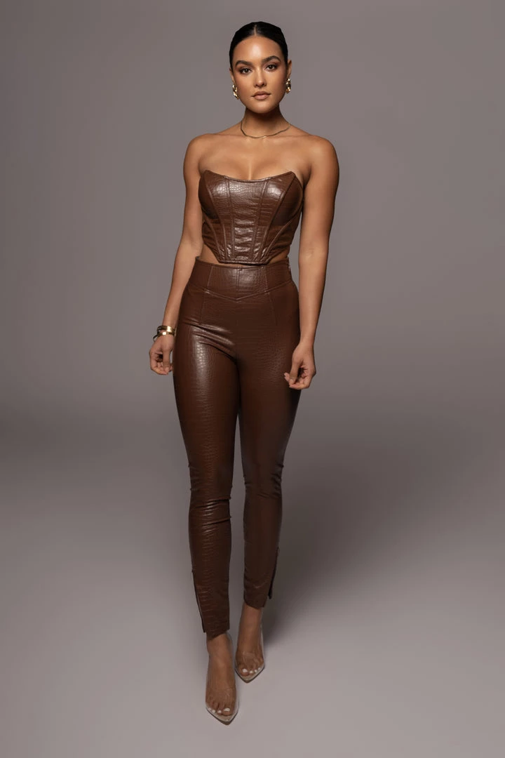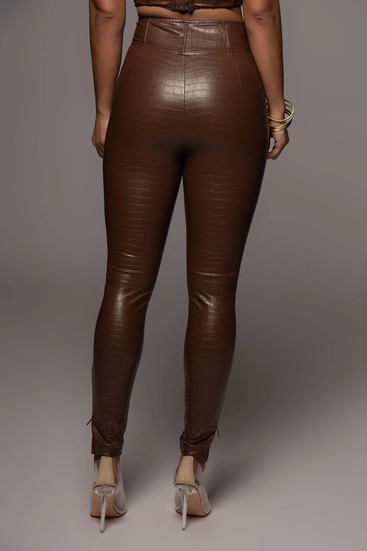 EXCLUSIVELY DESIGNED BY US FOR YOU. Get ready for the night in our CHOCOLATE MALENE CROC HIGH WAISTED PANTS. We have taken our signature ULTRA HIGH WAISTED SKINNY PANTS and redefined them in a fully croc embossed fabric for a bolder touch. These edgy faux leather pants highlight a flattering high waist with a boning detailed waist, skinny legs with zipper hems, and a hidden side zipper closure. Pair with our JAELYN CROC CORSET TOP for the full look. Minimal stretch.
