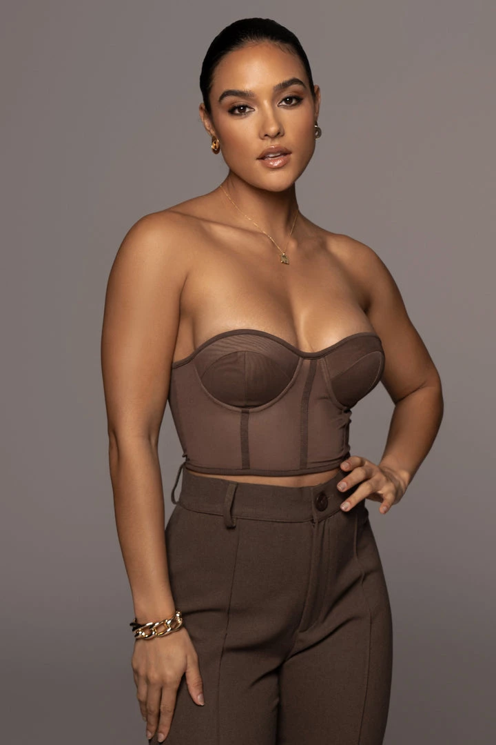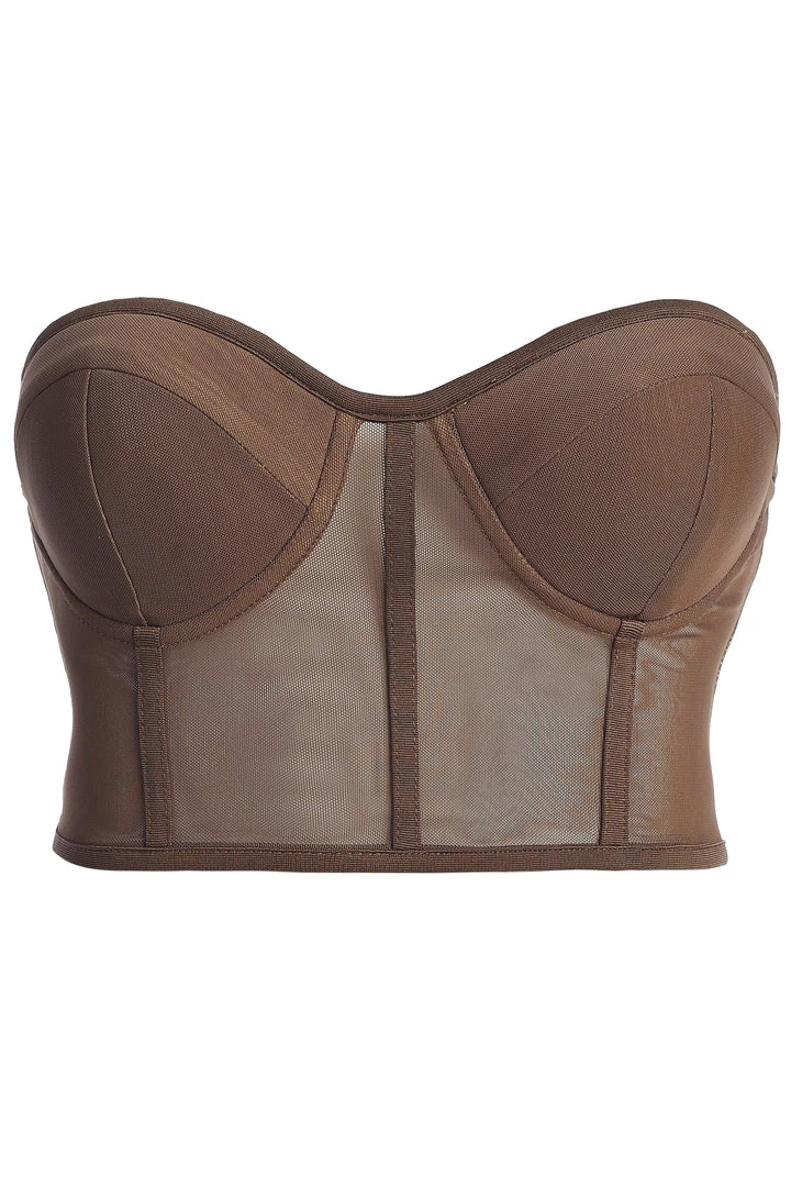EXCLUSIVELY DESIGNED BY US FOR YOU. Our current corset obsession only gets better with the CHOCOLATE SHAYLA BUSTIER! Featuring a strapless design with a sweetheart neckline and padded cups for support. Stunning boned trim detail throughout adds a finishing touch! Crafted in stretchy sheer mesh, this piece is one you can wear with anything. Adjustable hook and eye back for closure. Pair with the SELF MADE COAT and ARLETTE TROUSERS for the full look. Stretchy.Â