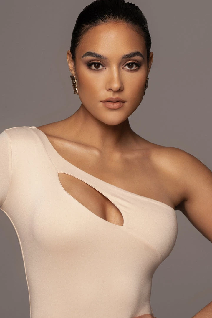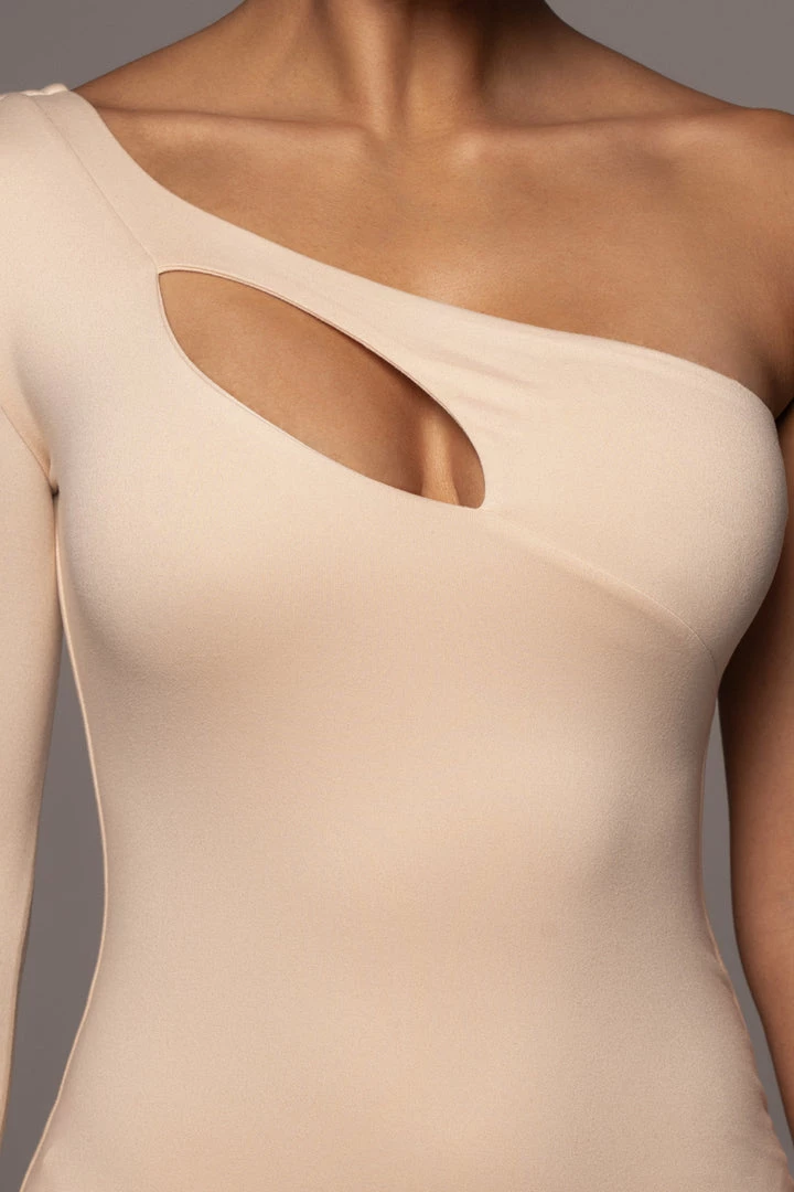 EXCLUSIVELY DESIGNED BY US FOR YOU. Smoother than butter in our CREAM FAIRA KEYHOLE DRESS! This classy body contouring dress is a must have in your everyday wardrobe. Designed in our double lined jersey fabric, this one shoulder sleeve dress showcases a bold cutout at the chest and a midi hem. Stretchy.