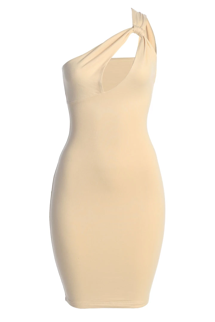 EXCLUSIVELY DESIGNED BY US FOR YOU. Our flirtiest cut is back in our CREAM JOANNA KEYHOLE DRESS! This stunning body hugging dress showcases a one shoulder neckline with a flirty keyhole cutout at the chest and a mini length hem. Designed in our smooth double lined fabric for compression with a soft touch. Stretchy.