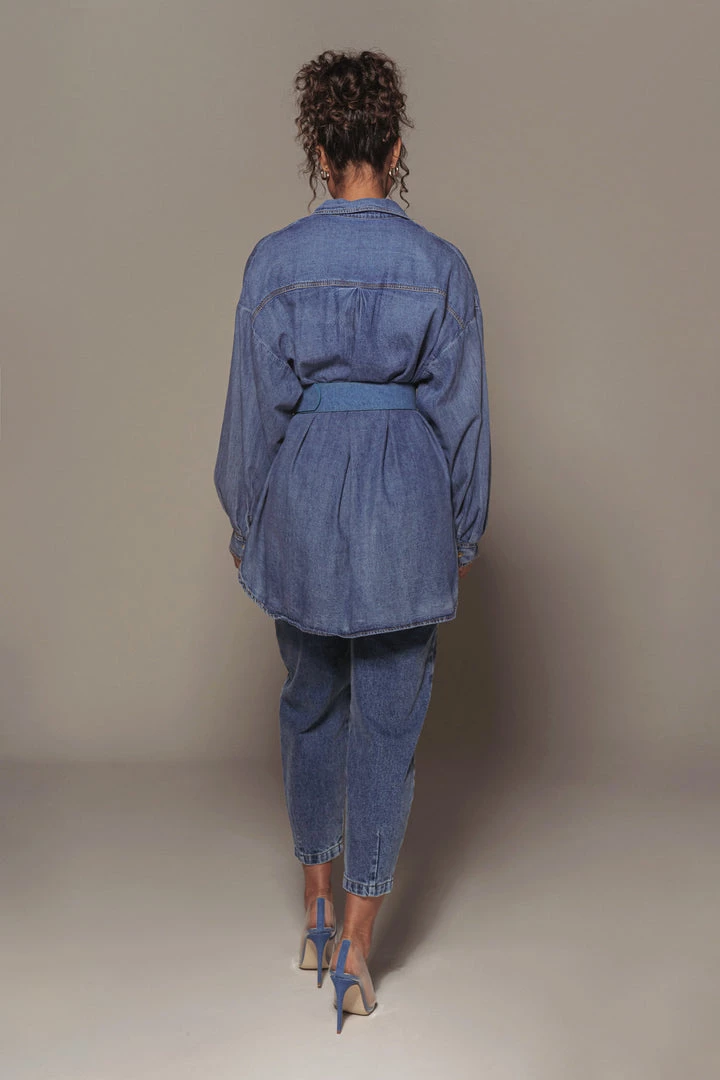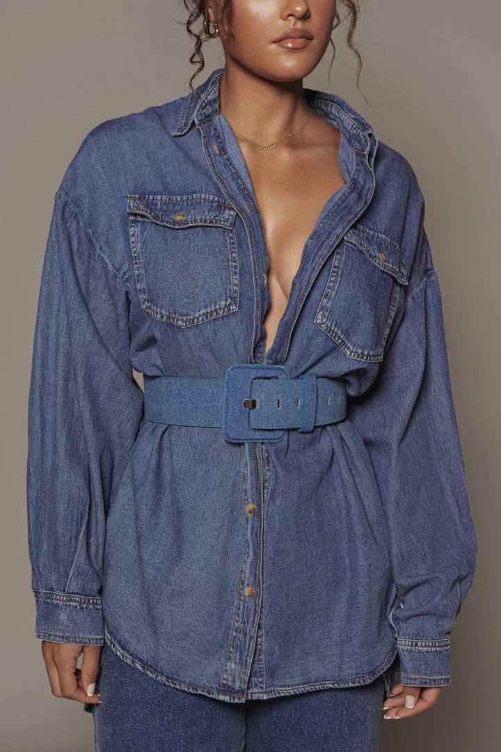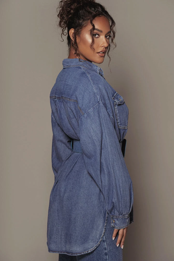 EXCLUSIVELY DESIGNED BY US FOR YOU. Stand out in perfect style with our new DENIM SIMPLE PLEASURES BUTTON UP. Featuring a collared neckline with long sleeves, a button front closure, two functional flap pockets, and button detail cuffs. Coordinate your outfit with our HARD TO FORGET DENIM BUSTIER and SUSAN DENIM SHORTS for a look that will take you from dinner to drinks and everything in between! No stretch. Oversized fit.