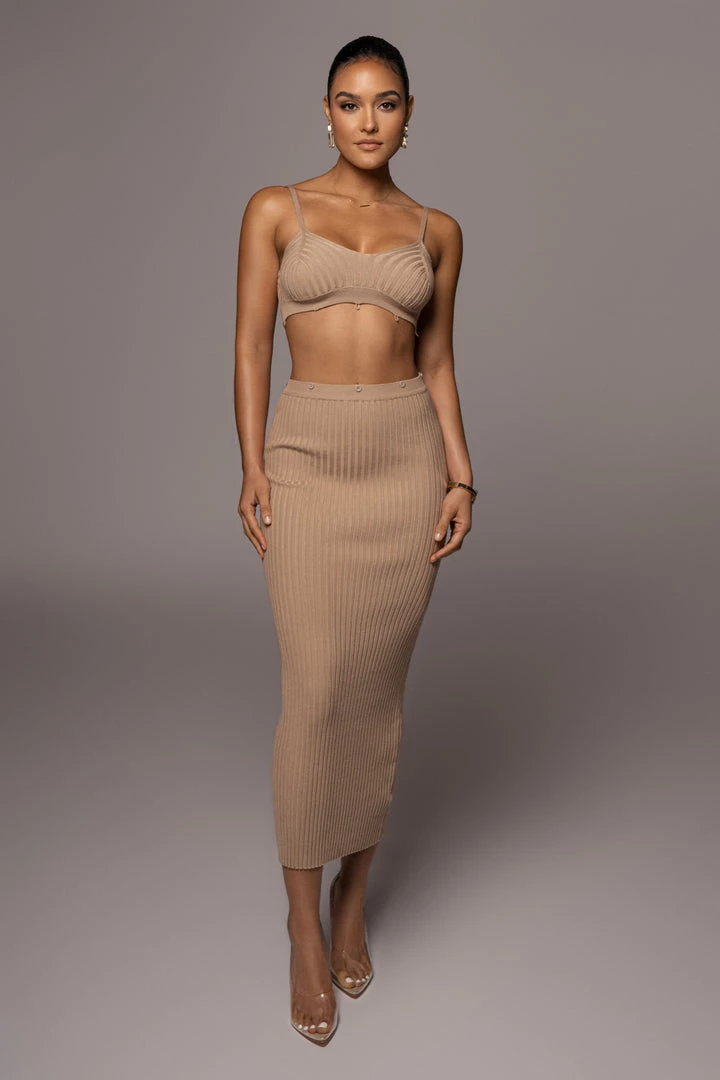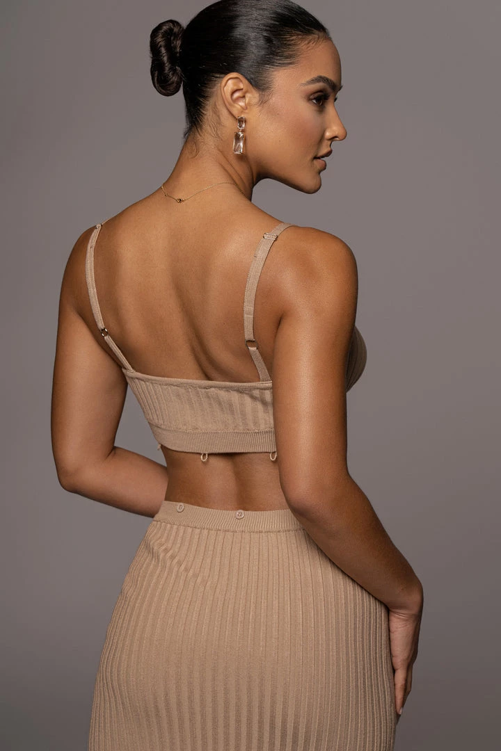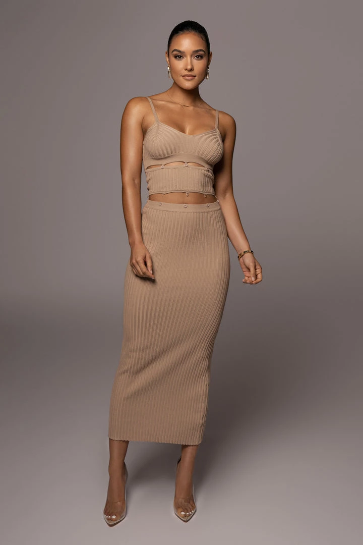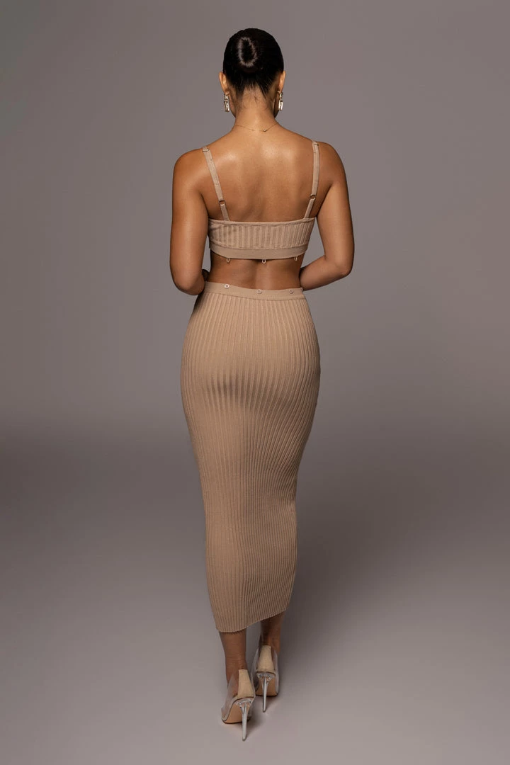 EXCLUSIVELY DESIGNED BY US FOR YOU. Show off new ways of styling with our BEIGE ELIZA MAXI DRESS. Featured in a fully ribbed knit material, this maxi dress comes with a low v-neckline, thin adjustable shoulder straps, and a stunning bodice with removable button loop attachments at the waist allowing versatile styling from a one piece dress to a two piece skirt set! Stretchy.Â