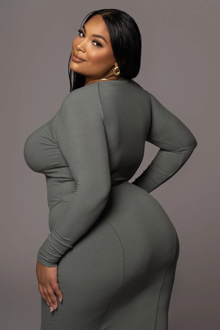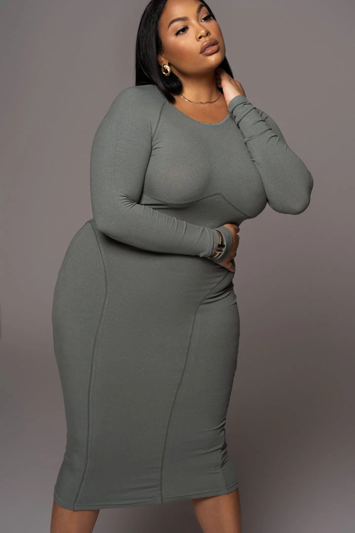 EXCLUSIVELY DESIGNED BY US FOR YOU. You’ll be forever flattering in our GREEN HIGH EXPECTATIONS MIDI DRESS. This fully ribbed midi dress is designed in a form fitting silhouette with a classic neckline and long sleeve arms. Exposed seam stitching throughout adds a modern touch. Stretchy.