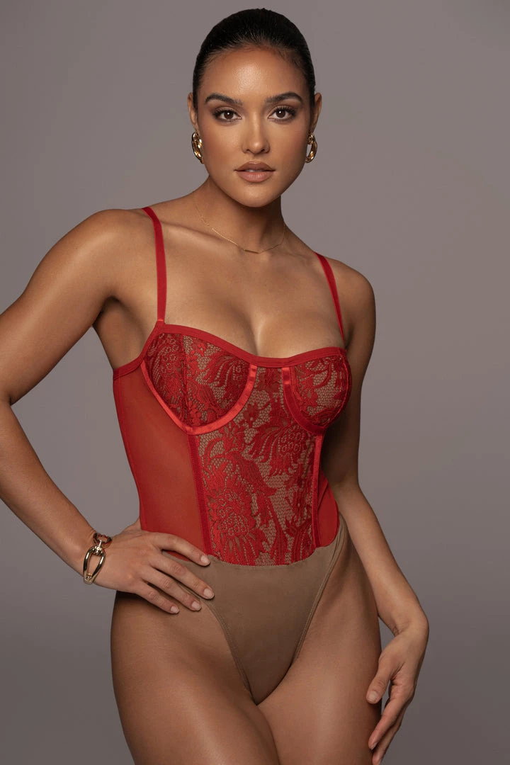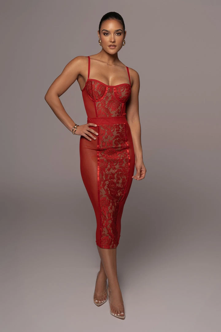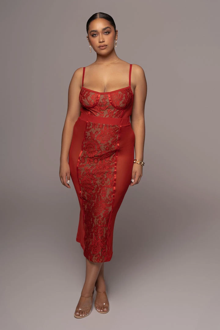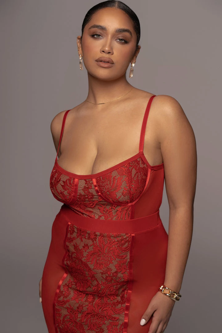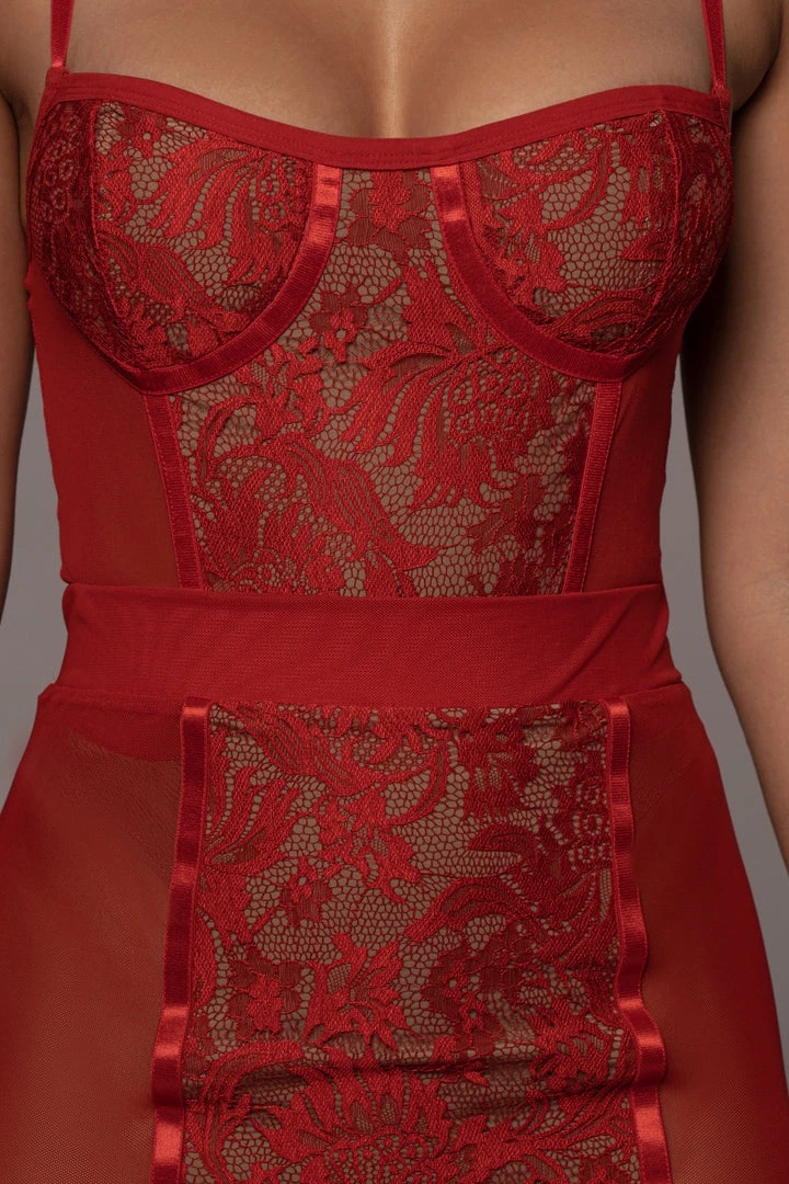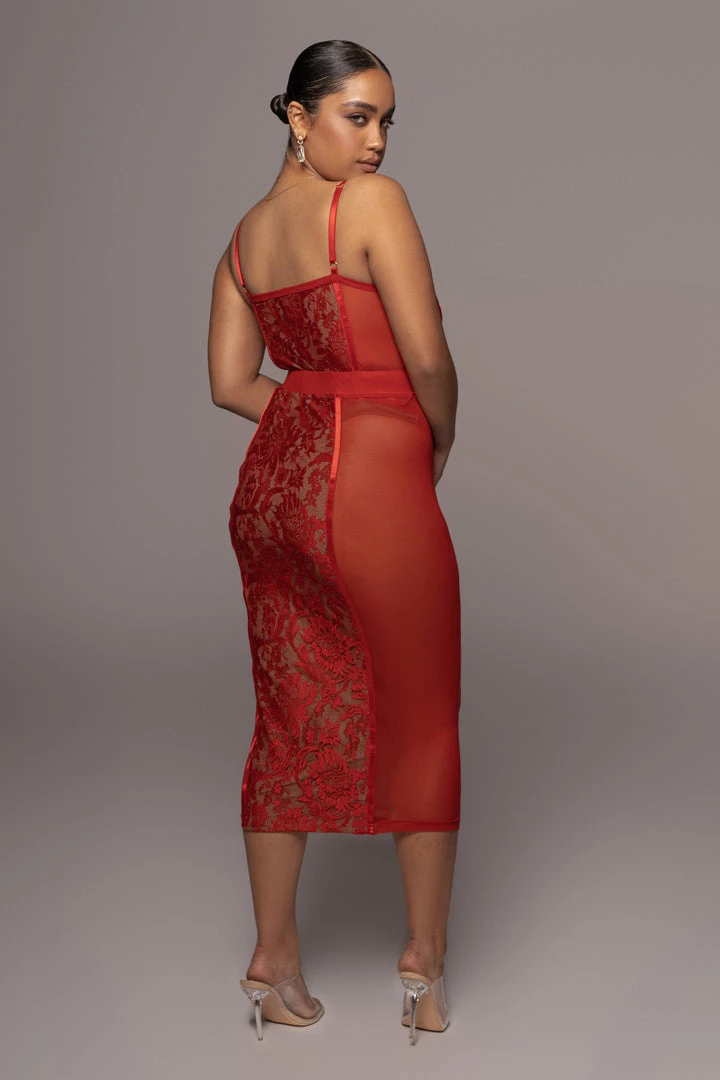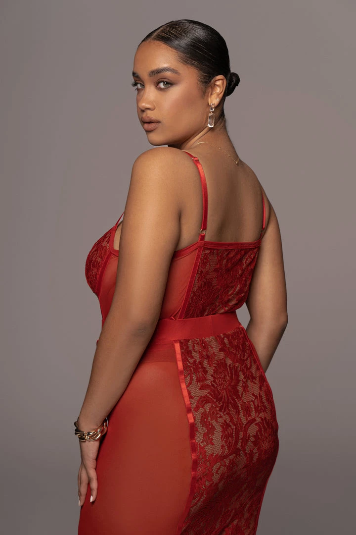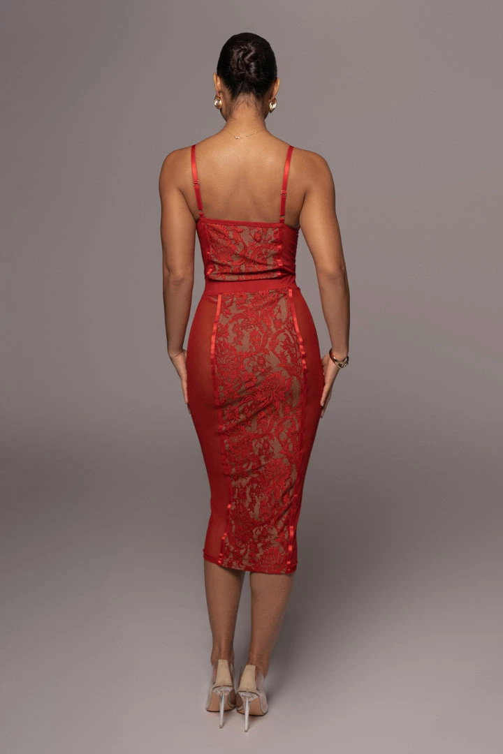 EXCLUSIVELY DESIGNED BY US FOR YOU. Our RED NIYKEE MESH & LACE SET is a masterpiece of its own. Lace accents placed delicately over mesh fabric make this two tone, two piece set a head turner! A two piece set featuring a bodysuit with adjustable shoulder straps, a fitted bodice, and a thong back with snap button for closure. The matching skirt is topped with an elastic waistband and comes with a flattering bodycon fit that ends in a classy midi length hem. Both pieces are detailed with captivating lace detailing down the center front and back. Stretchy. Sold as a set.
