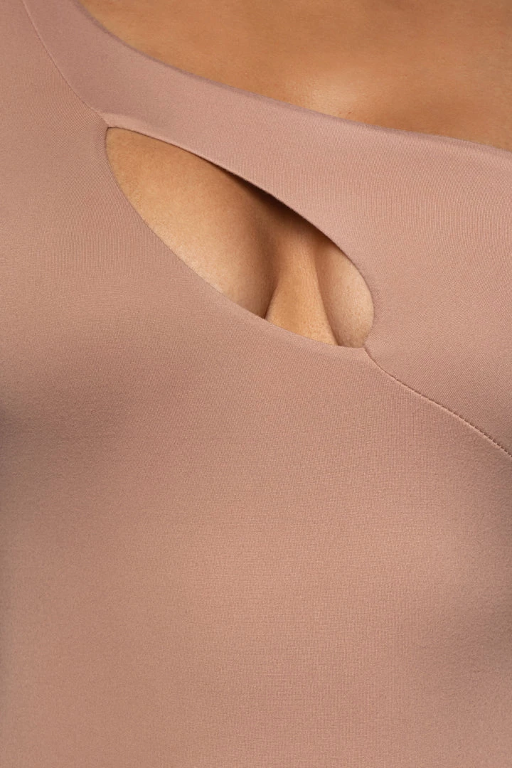 EXCLUSIVELY DESIGNED BY US FOR YOU. Our FRAPPE DARLA KEYHOLE BODYSUIT is a soft one shoulder bodysuit that showcases a bold keyhole at the front with a fitted long sleeve. Designed in our double line jersey fabric for compression support achieving a flattering silhouette. Complete with a thong bottom and snap button closure. Pair with your favorite bottoms for an unforgettable night out! Stretchy.