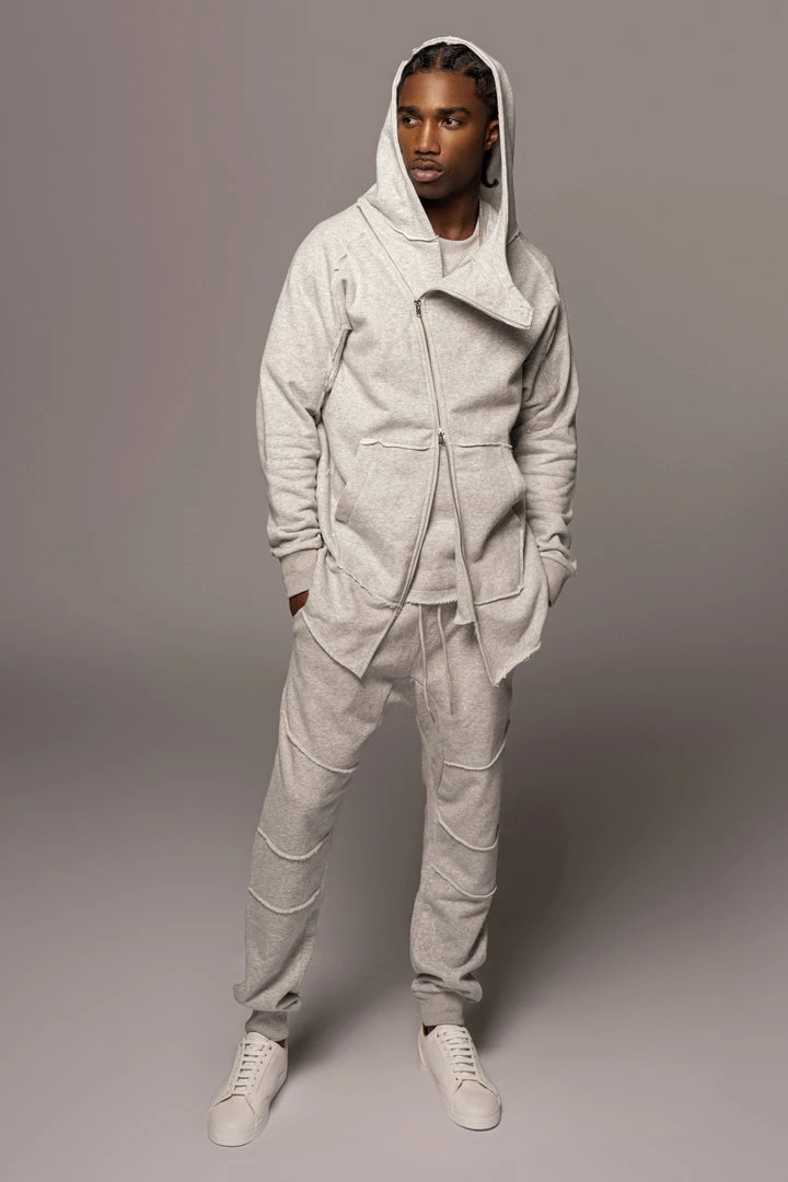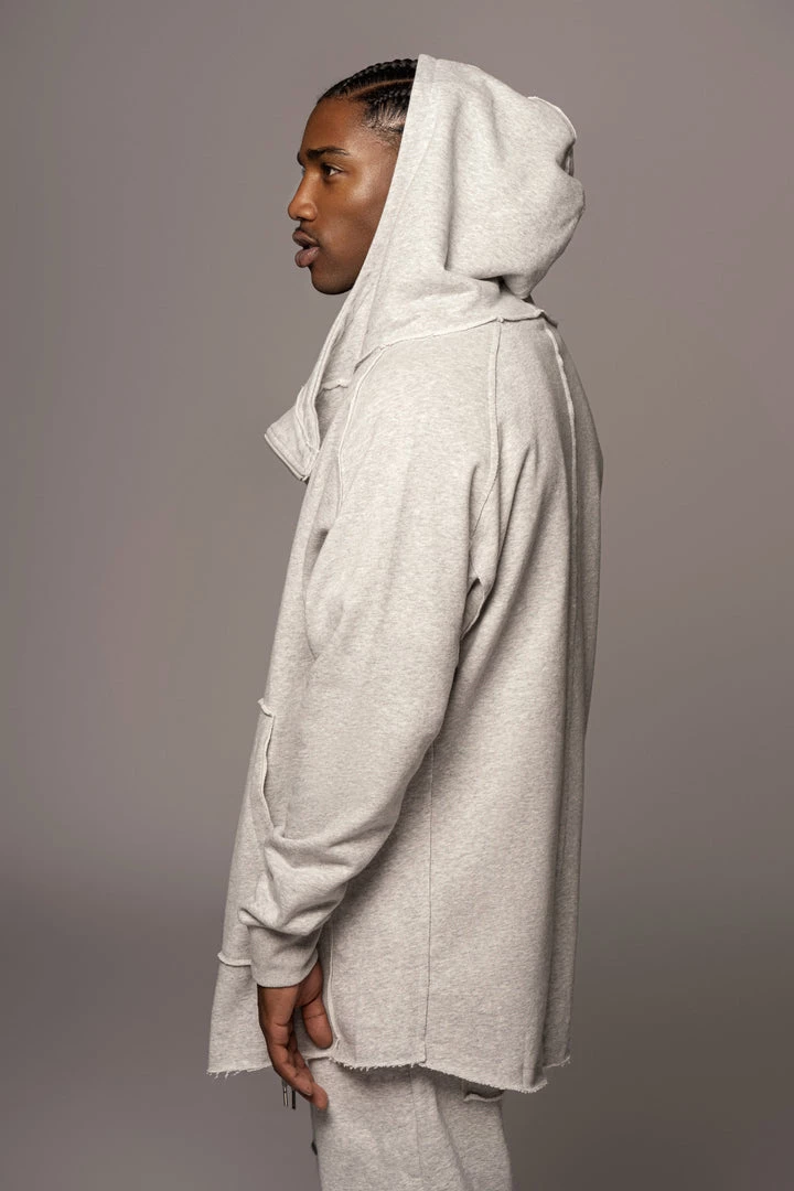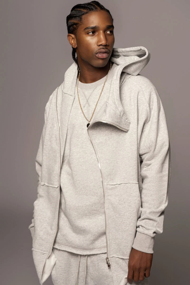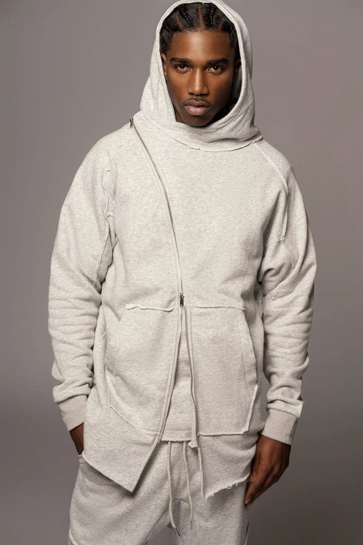 EXCLUSIVELY DESIGNED BY US FOR HIM. Our GREY JORDYN MEN’S ZIP UP adds a sharp touch to your ensemble any day! Designed in a soft and stretchy blend, this long sleeve men’s hoodie features a hooded neck with a two way asymmetric zipper, split kangaroo pockets, and raw cut details throughout with a raw hemline. Pair with our KALEB MEN’S JOGGERS and LOGAN RAW EDGE TEE for the full look. Fitted cuffs. Oversized.