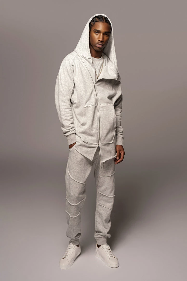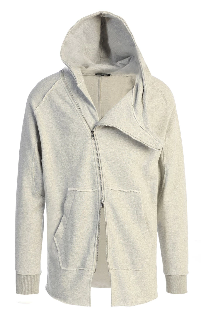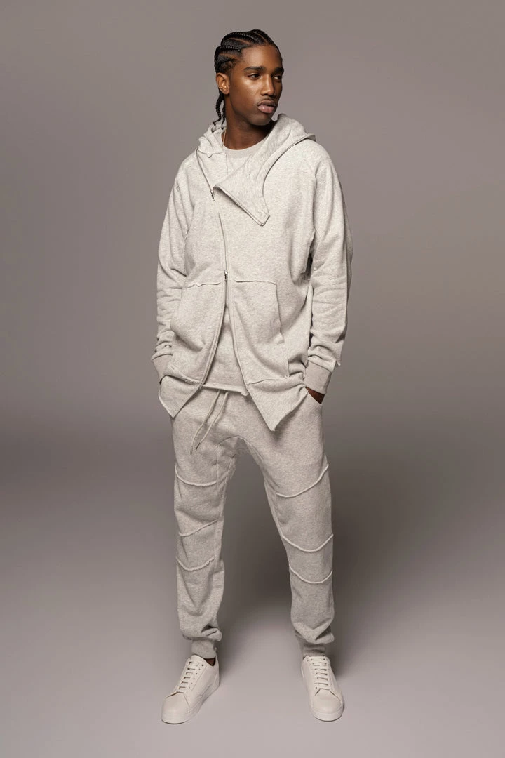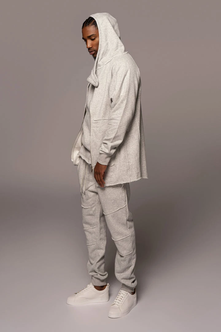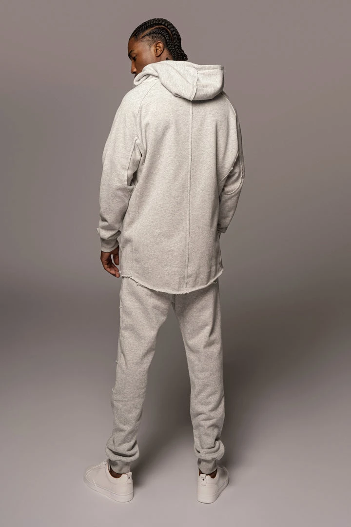 EXCLUSIVELY DESIGNED BY US FOR HIM. Our GREY JORDYN MEN’S ZIP UP adds a sharp touch to your ensemble any day! Designed in a soft and stretchy blend, this long sleeve men’s hoodie features a hooded neck with a two way asymmetric zipper, split kangaroo pockets, and raw cut details throughout with a raw hemline. Pair with our KALEB MEN’S JOGGERS and LOGAN RAW EDGE TEE for the full look. Fitted cuffs. Oversized.