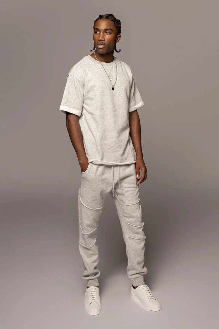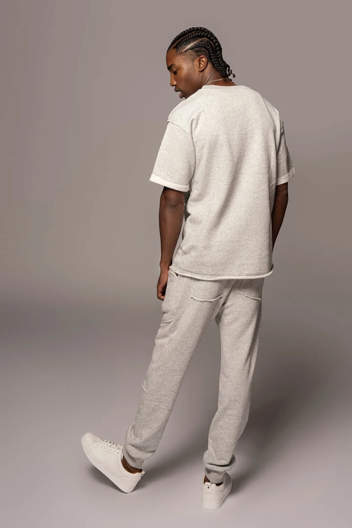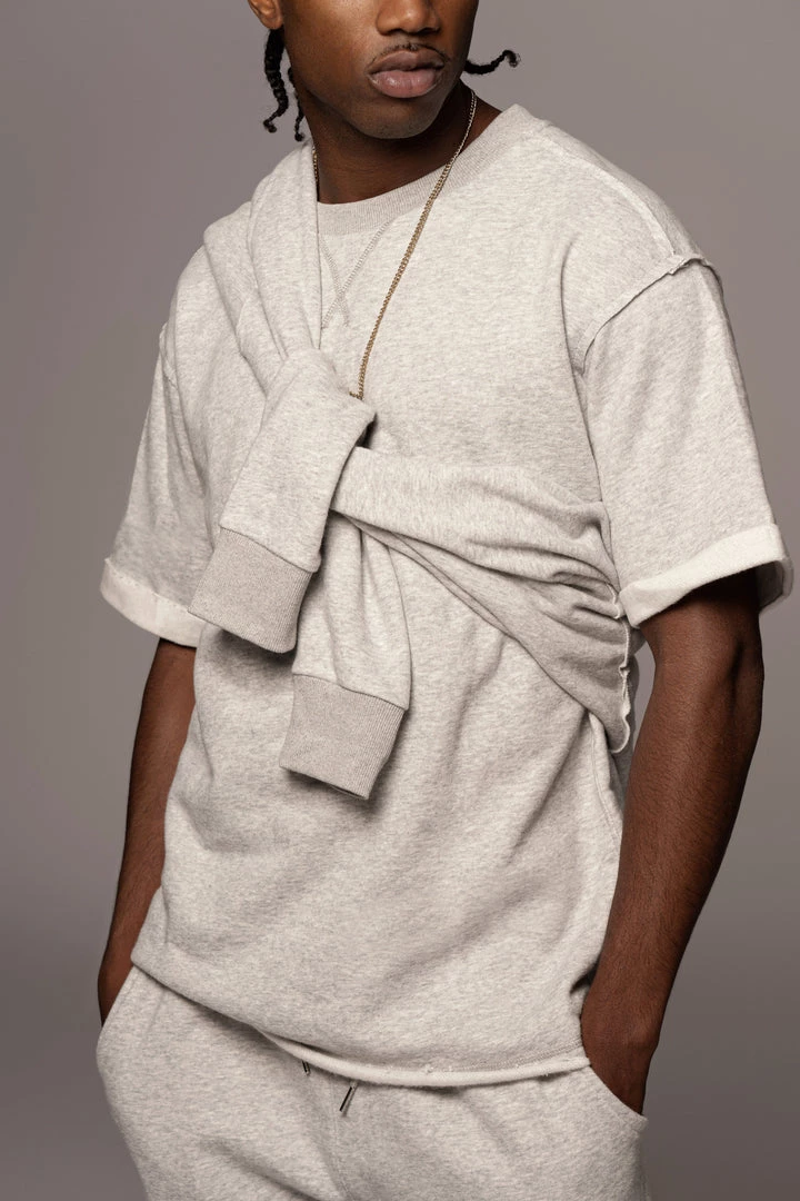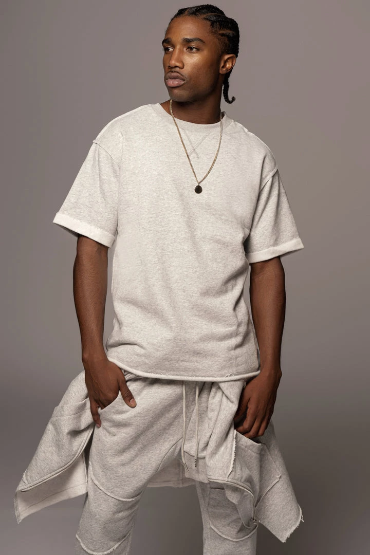EXCLUSIVELY DESIGNED BY US FOR HIM. Never ending comfort is within reach in our GREY LOGAN RAW EDGE TEE! This oversized short sleeve tee features a crew neckline with edgy raw cut hems and rolled up sleeves for a modern touch. Made in a soft and stretchy blend for superior fit and comfort. Coordinate the full look with our KALEB MEN’S JOGGERS and JORDYN MEN’S ZIP UP. Stretchy.