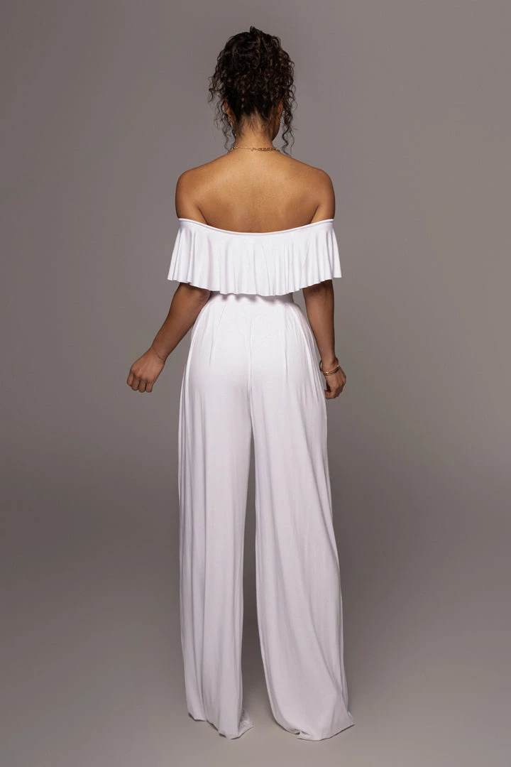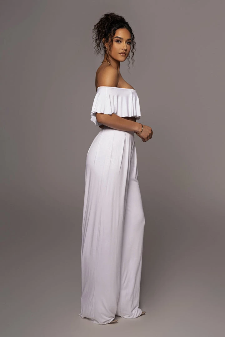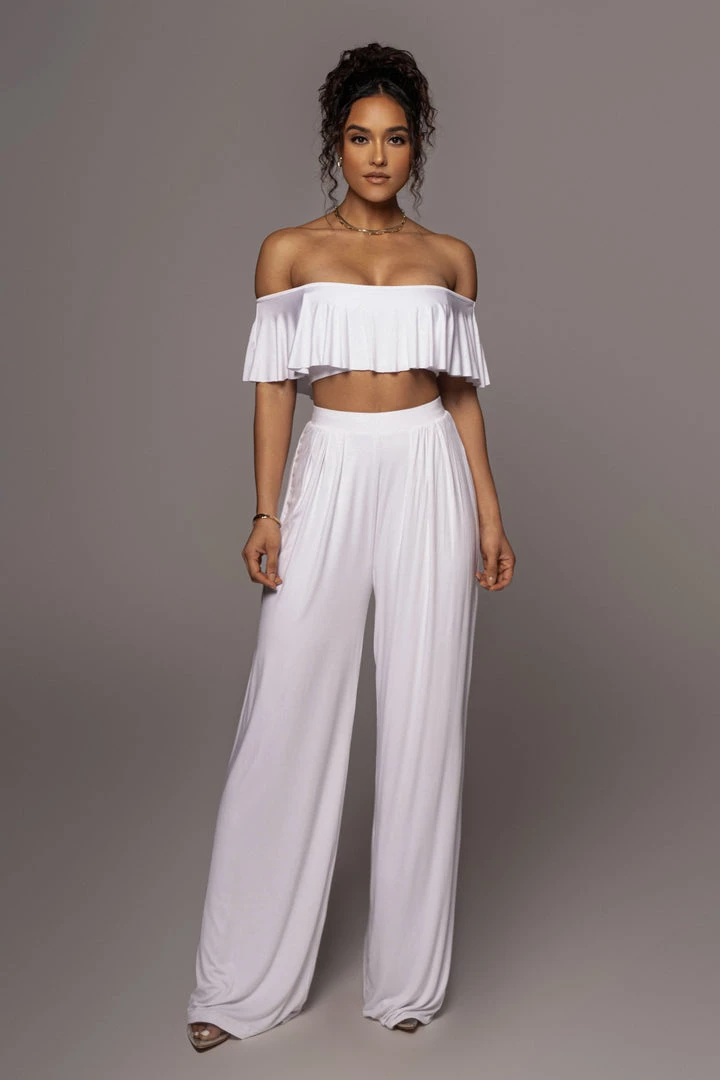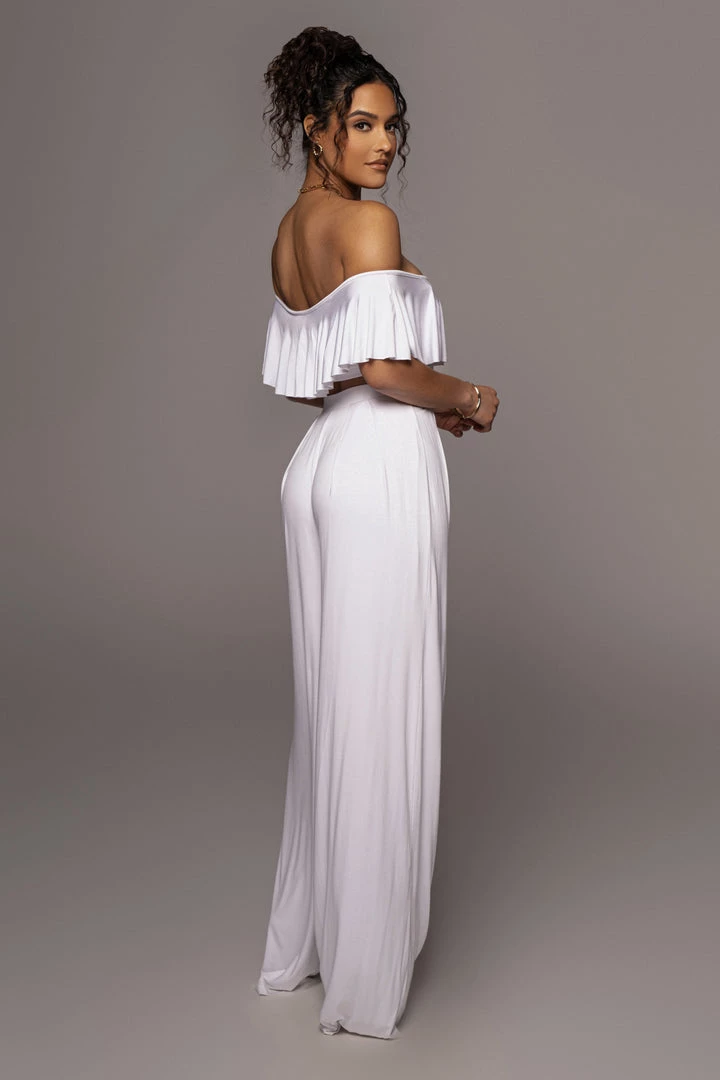 EXCLUSIVELY DESIGNED BY US FOR YOU. Add a touch of flare to your look with the IVORY CLOSE TO YOU SET! Crafted in double lined jersey material, this two piece pant set features a cute crop top with an off the shoulder neckline and trendy ruffle trim. The pant bottoms of the set are topped with an elastic waistband and fall down to classy wide leg hems. Stretchy. Sold as set.