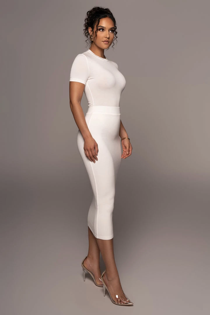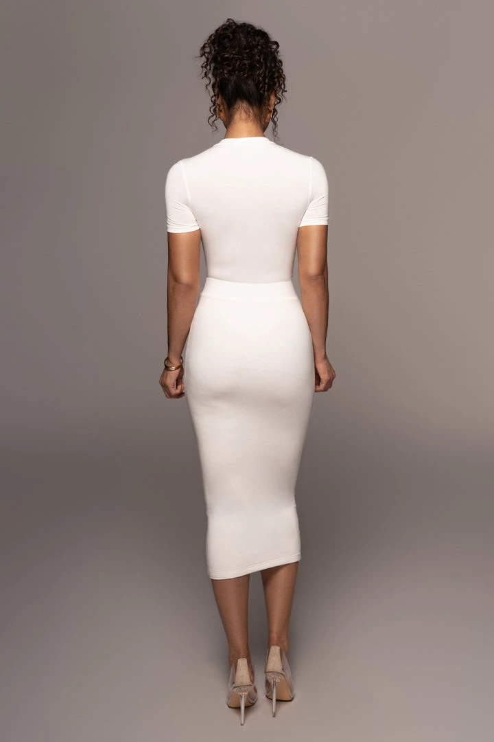 EXCLUSIVELY DESIGNED BY US FOR YOU. You’ll be immediately drawn to our IVORY LEILAH MIDI SKIRT. Designed with comfort in mind, this timeless pencil style skirt can be worn in so many ways. Topped with an elastic waistband for a cinched waist and minimal seams for a smooth finish. Double lined. Stretchy.