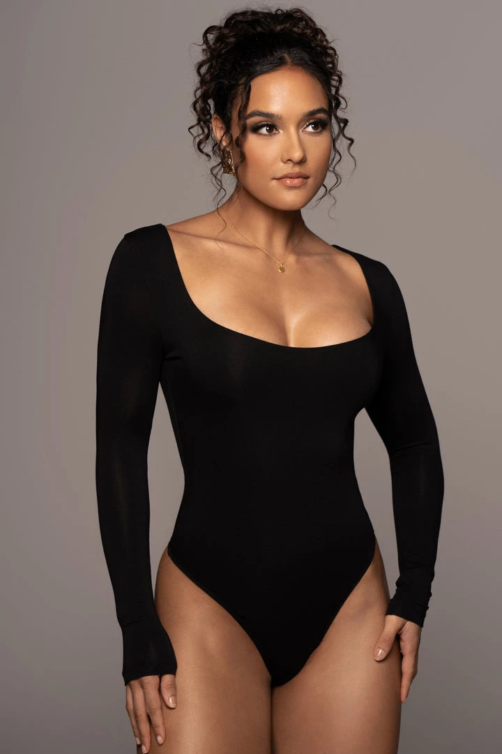 EXCLUSIVELY DESIGNED BY US FOR YOU. Super soft and so flattering is our BLACK BETHIE SCOOP LONG SLEEVE BODYSUIT! Featuring a low scoop neckline, fitted long sleeves, and a thong bottom with double snap closure. Crafted in our smooth double lined JLUXBASIX fabric for compression and to flatter every curve. Stretchy.