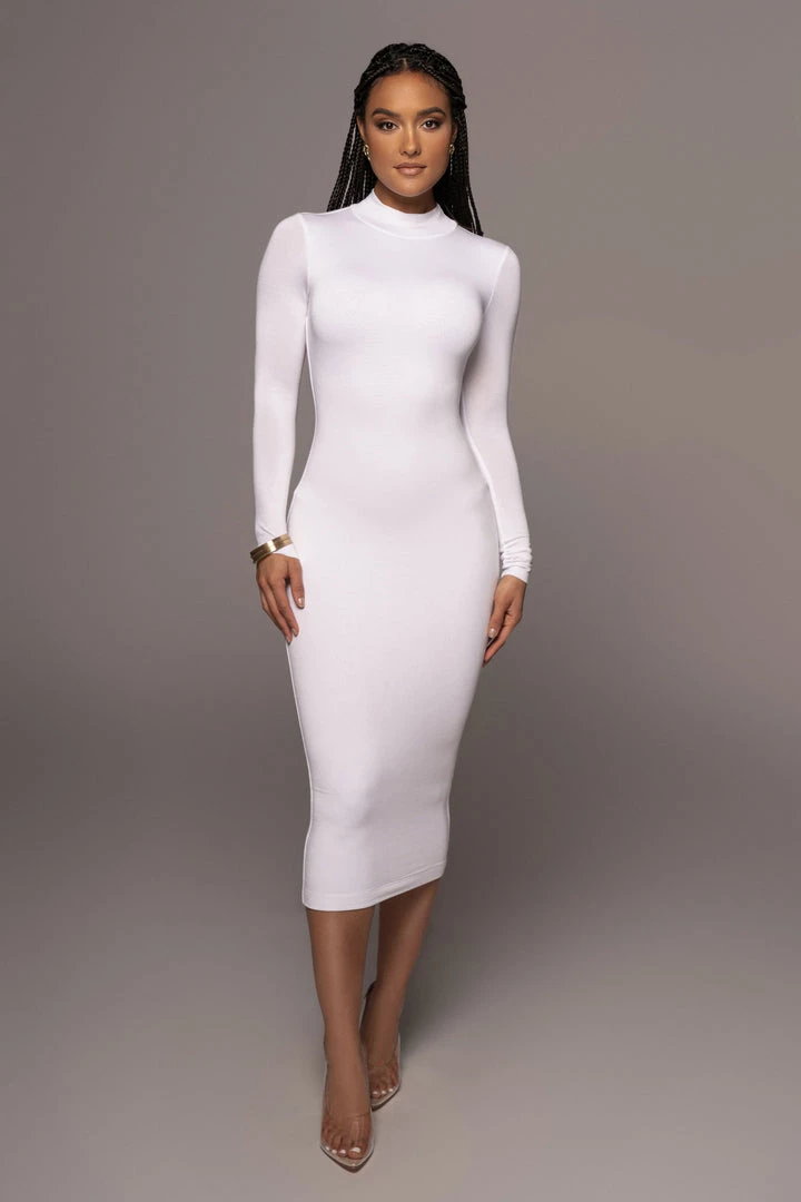 EXCLUSIVELY DESIGNED BY US FOR YOU. One of our most popular Jluxbasix pieces has proved to be a must have in your wardrobe! The IVORY JANESSA TURTLENECK DRESS features a turtleneck and long sleeve arms with a bodycon silhouette ending in a classy midi length hem. Designed in a thick double lined material to smooth any imperfections. Dress it up dress it down! Stretchy.