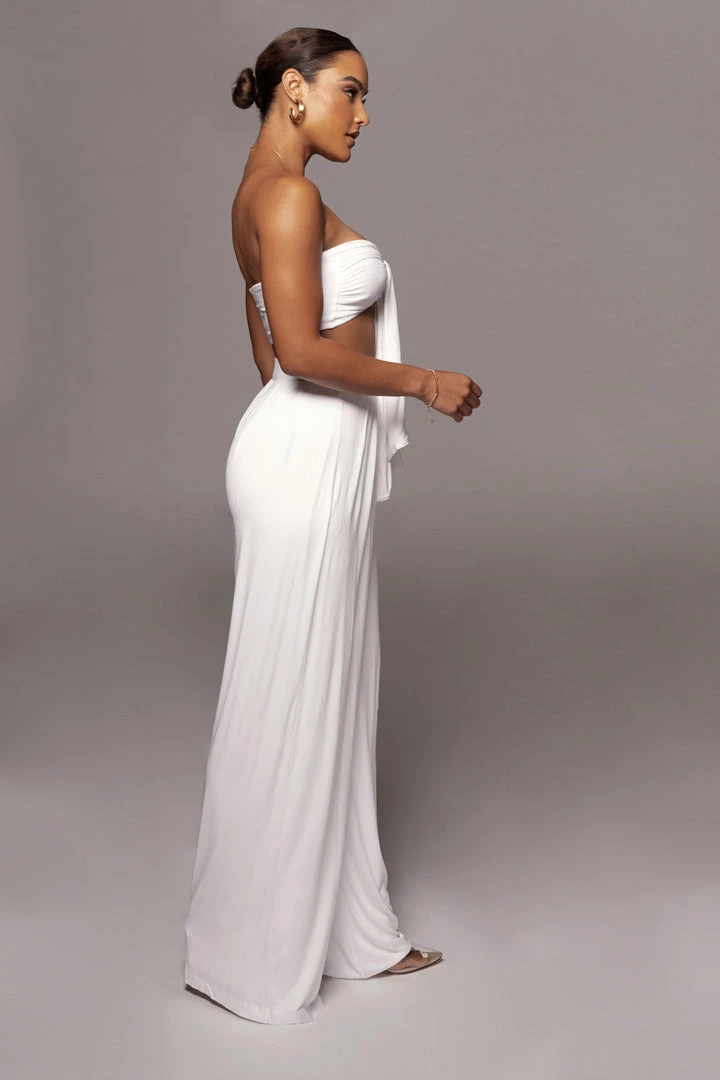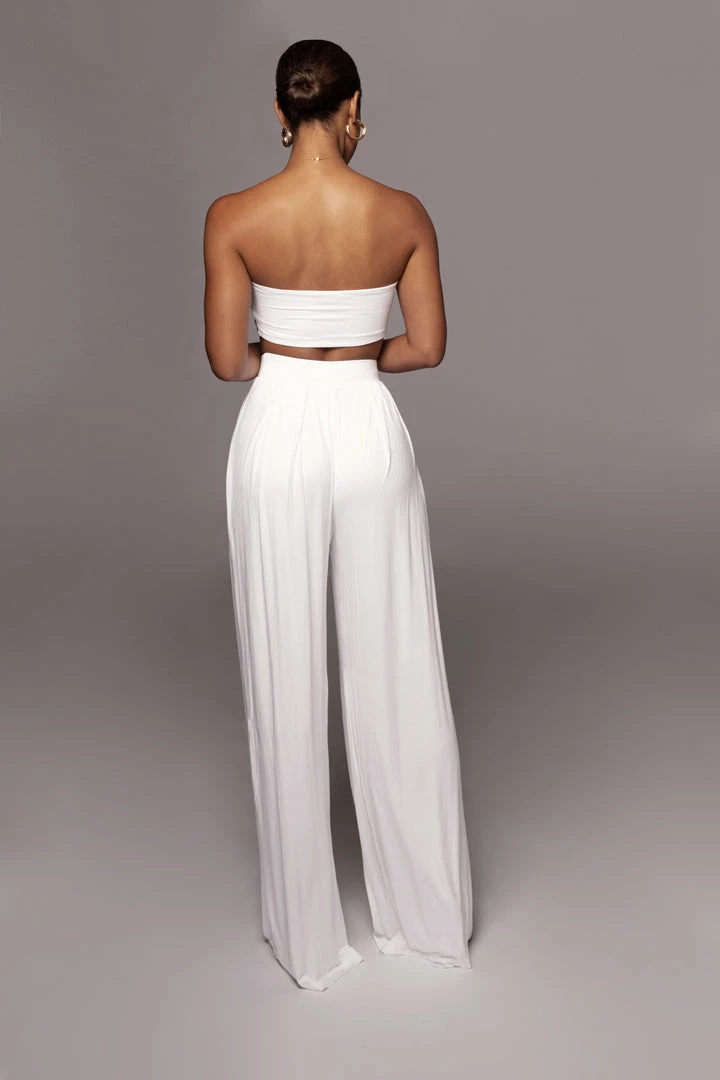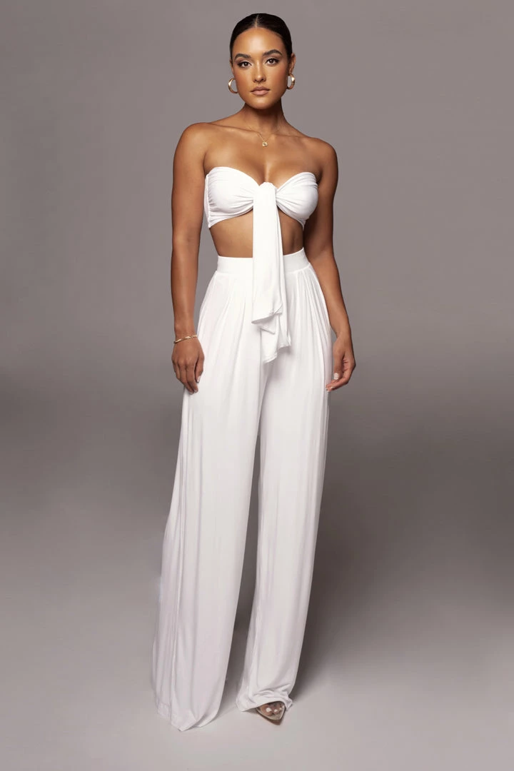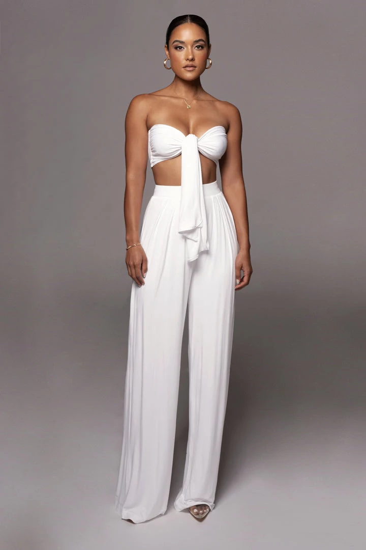 EXCLUSIVELY DESIGNED BY US FOR YOU. Our IVORY TORY TWO PIECE SET transitions amazingly from day to night in any situation! Designed in our soft and stretchy double lined fabric for superior comfort. The top features a stunning tie front detail with an elastic back, and the matching high waist pants are topped with an elastic waistband and trendy wide legs that complete the look! Wear together or separate, this versatile two piece set is easy to mix and match! Stretchy. Sold as set.