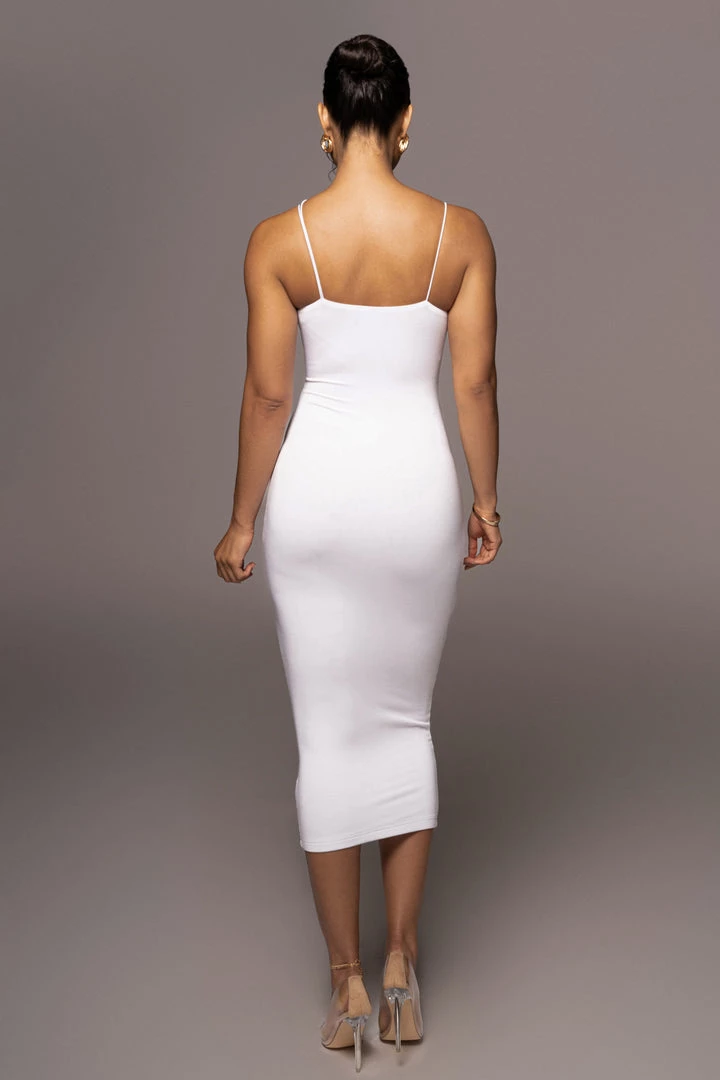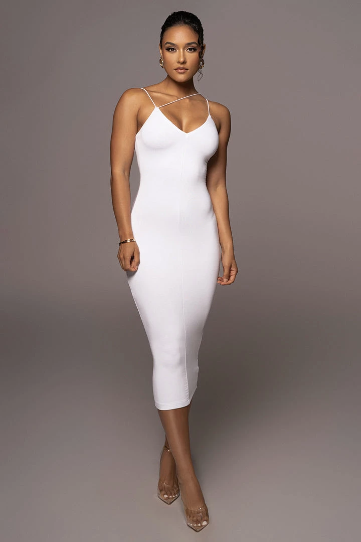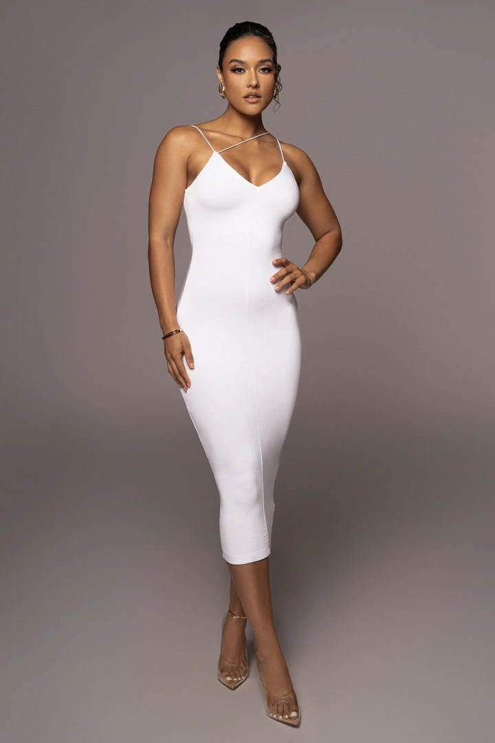 EXCLUSIVELY DESIGNED BY US FOR YOU. Our JLUXBASIXÂ IVORY VALENCIA DIAGONAL STRAP DRESS is a dress you’ll want to wear on repeat! A flirty midi length dress showcasing a plunging v-neckline with thin bungee straps and a diagonal bungee strap detail across the chest to finish the look. Designed in our super soft double lined fabric for a superior fit and comfort. Stretchy.