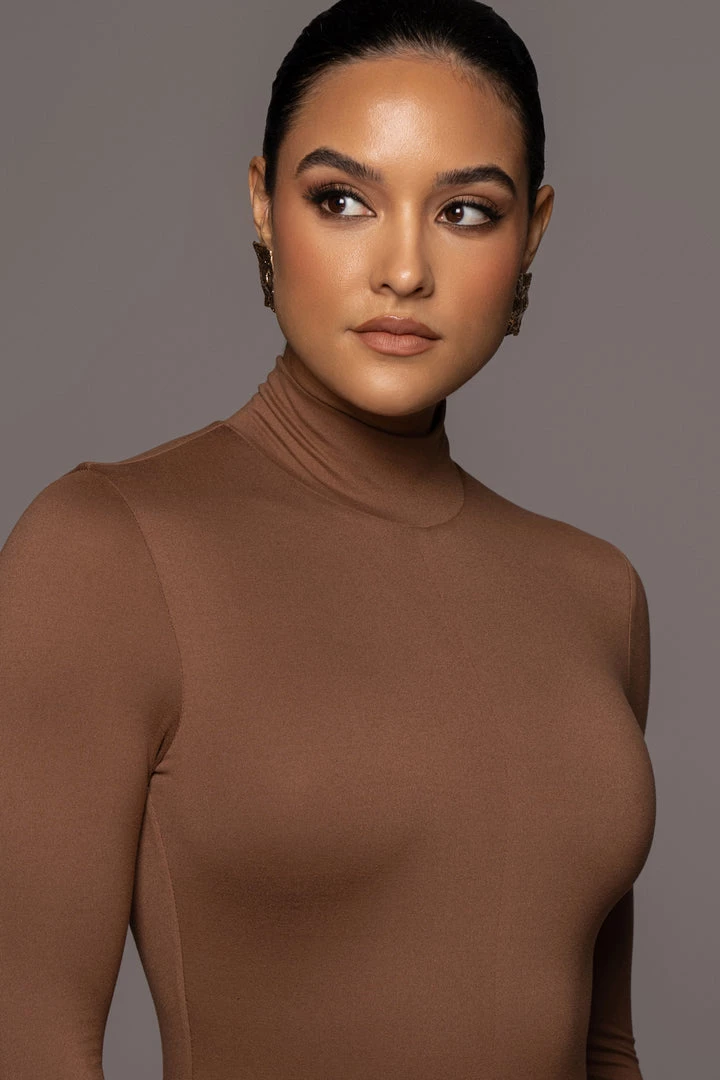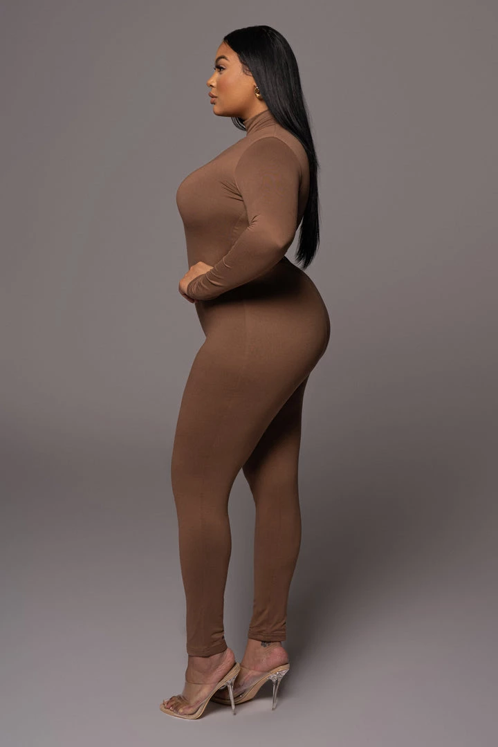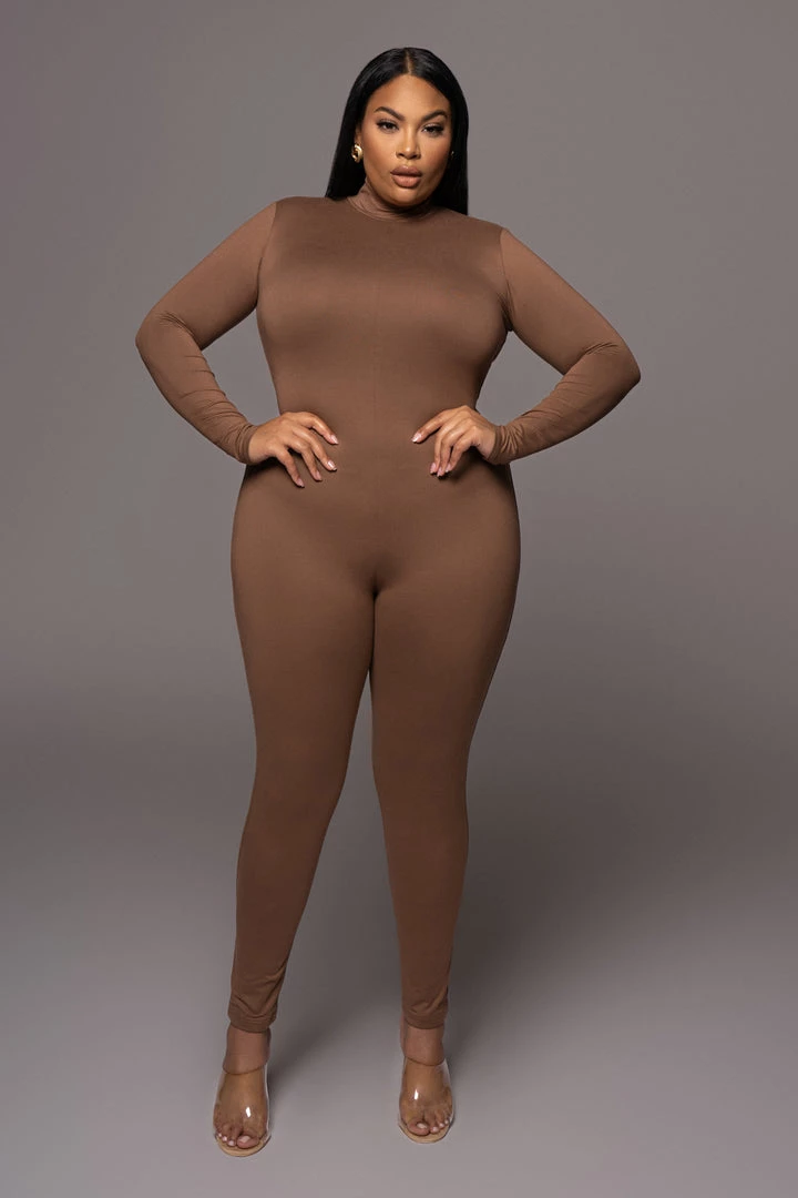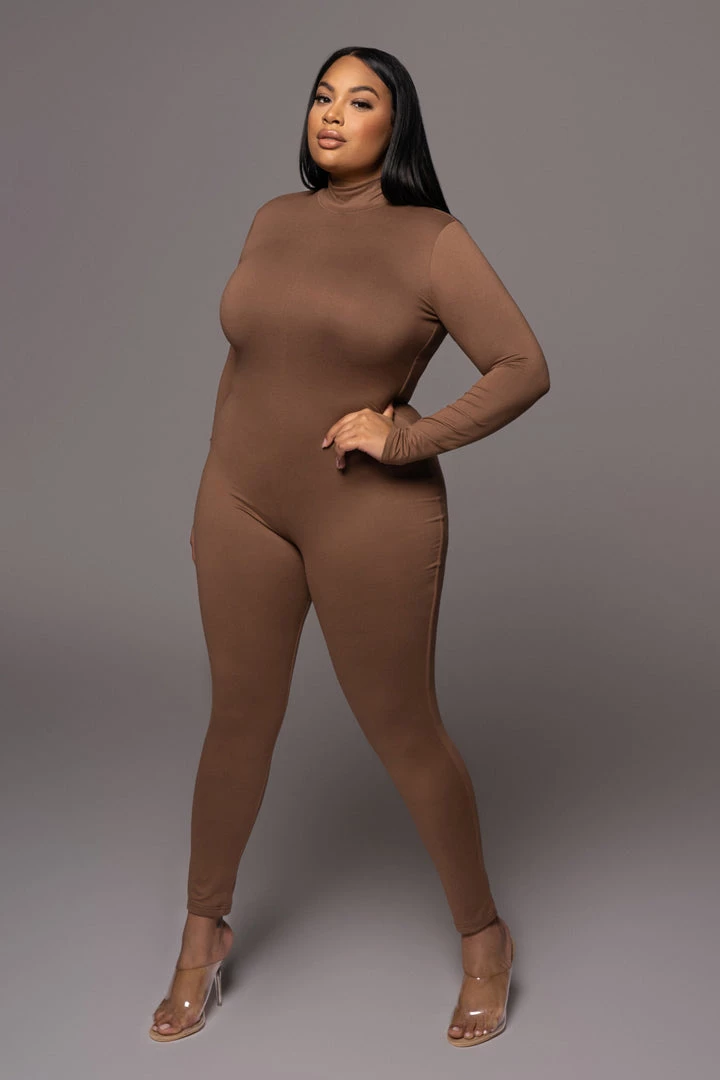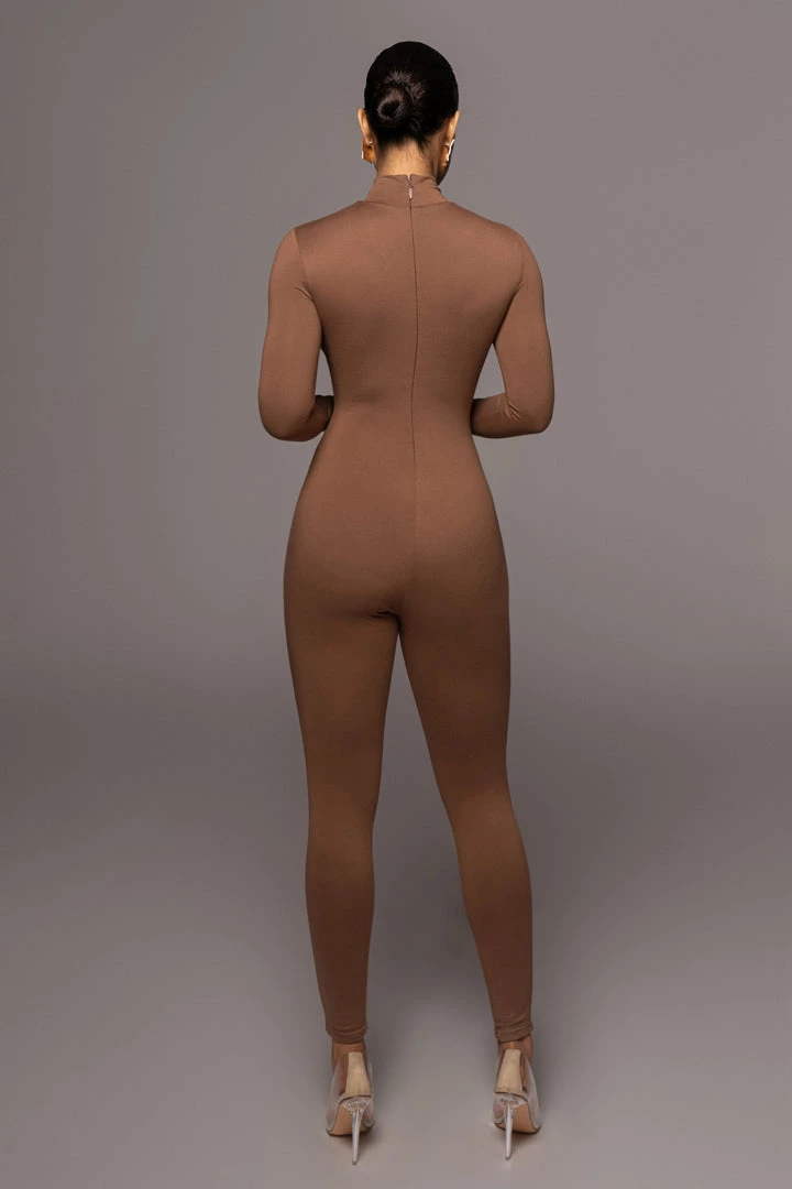 EXCLUSIVELY DESIGNED BY US FOR YOU. Our JLUXBASIX PECAN RAISA JUMPSUIT is a jumpsuit worth the wait! If you loved our best seller the ZABI JUMPSUIT, you’ll be just as obsessed with our latest design. This body hugging jumpsuit is designed in a smooth double lined jersey fabric and comes with a mock neck, long sleeve arms, and skinny leg hems. Complete with back zipper for closure. Stretchy.