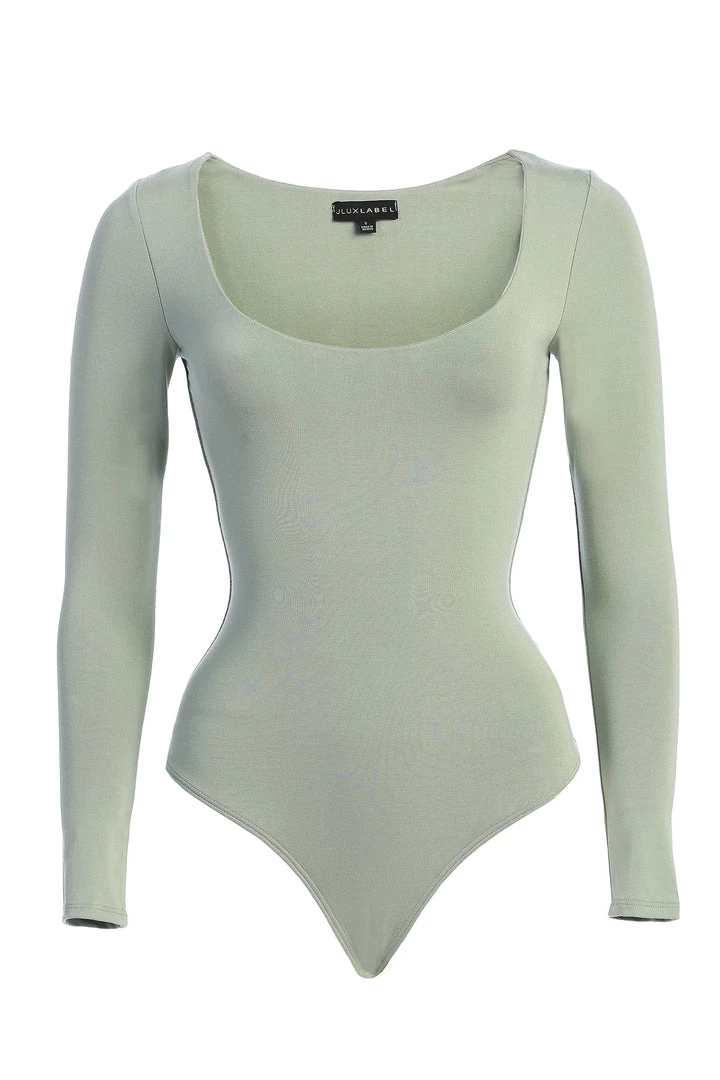 EXCLUSIVELY DESIGNED BY US FOR YOU. Achieve a classic look with our JLUXBASIX SAGE ALEAH U NECK BODYSUIT. Designed in our ultra soft and smooth double lined fabric, this long sleeve bodysuit features a u-neckline and a solid bodice that leads down to a thong bottom with double snap closure. Pair with your favorite JLUXLABEL bottoms for a full look! Stretchy. Double lined.