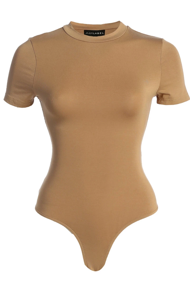EXCLUSIVELY DESIGNED BY US FOR YOU. Our JLUXBASIXÂ TAN IDEAL BODYSUITÂ is the ultimate base layer! This essential bodysuit lives up to its name featuring a classic crew neckline with short sleeves, and a supportive, figure hugging fit to embrace your curves. Crafted in our double lined jersey fabric for quality and comfort. Thong back with snap buttons for closure. Stretchy.