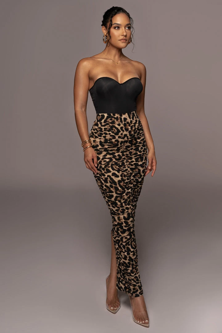 EXCLUSIVELY DESIGNED BY US FOR YOU. Take your style to a fierce note in our new LEOPARD KARMEN RUCHED SKIRT. Featured in a bold leopard print, this fully ruched skirt is topped with an elastic waistband and details a stylish lower back slit with maxi length hem. Pair with our MONROE SHAPEWEAR BUSTIER BODYSUIT for the full look. Stretchy.