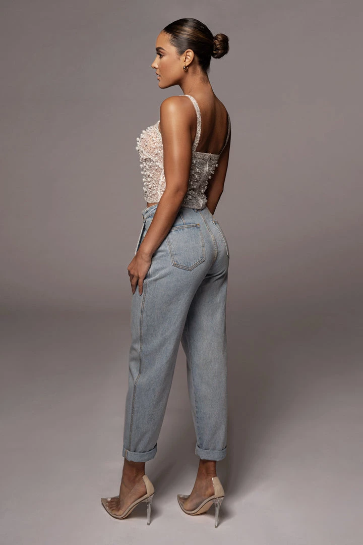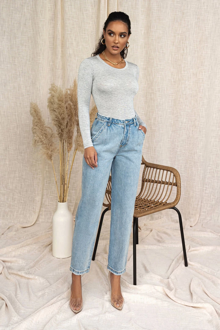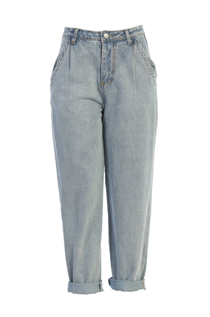 EXCLUSIVELY DESIGNED BY US FOR YOU. Start your day with ease in our LIGHT WASHED RELAXED JEANS. These stylish denim jeans feature a fitted high waist with button/zipper closure, notable darts, and relaxed tapered legs. Subtle distressing at the hems adds a finishing touch. Belt loops. No stretch.