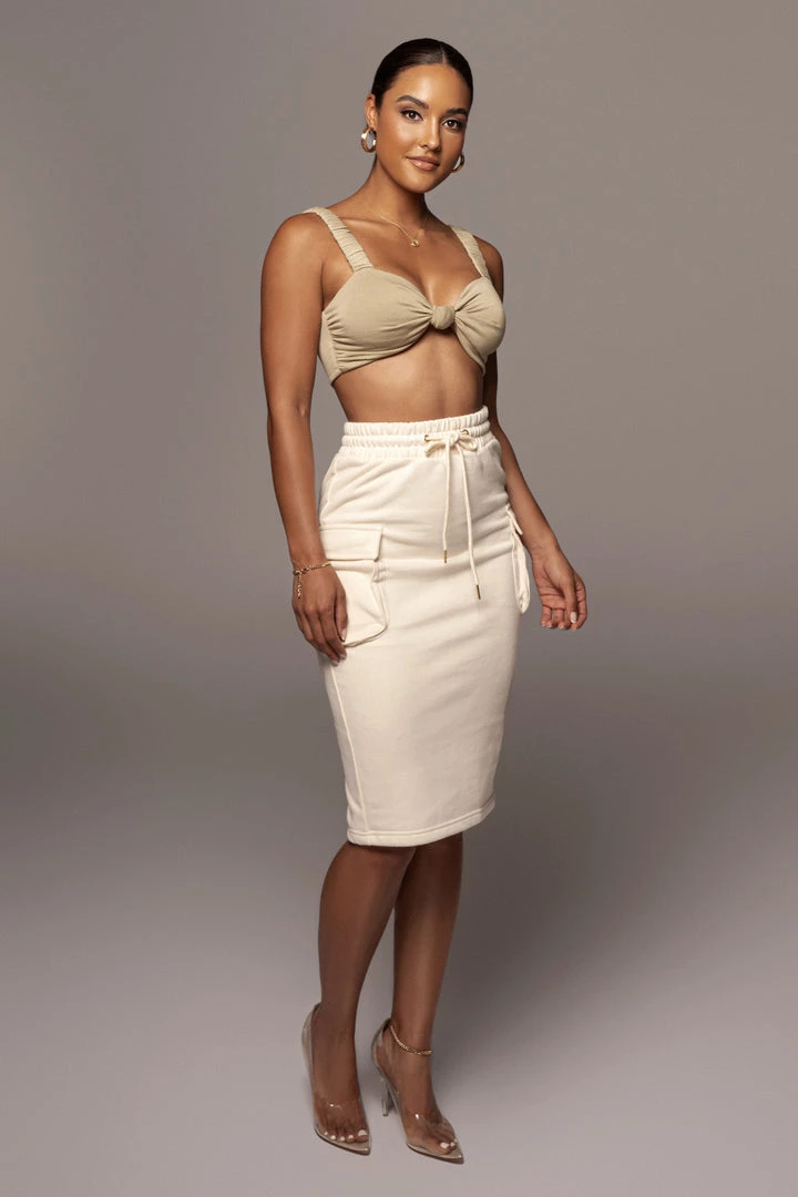 EXCLUSIVELY DESIGNED BY US FOR YOU. Take your crop top wardrobe to new levels in our MOSS KILEY CROP TOP! This stunning bralette top highlights a sweetheart neckline with front knot detail, elastic ruched tank shoulders, and an elastic ruched back. Designed in a soft fabric with mesh interior lining for a quality feel. Add our STEEL FLEECE CARGO SKIRT to your look for an elevated ensemble that outshines the competition. Stretchy.