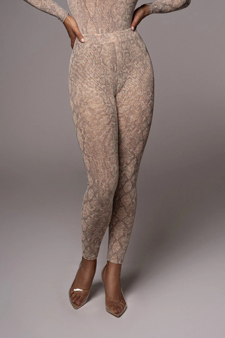 EXCLUSIVELY DESIGNED BY US FOR YOU. Our natural LAYLANI MESH LEGGINGS are the ideal bottoms for moments where you feel fully untamed! A fierce snakeskin print boldly emphasizing the look of these leggings. Designed in stretchy double lined mesh, these high rise bottoms feature a body forming silhouette with an elastic waistband. Finish the look to this  that can be styled for your next getaway or a night out of town. Stretchy with lining.