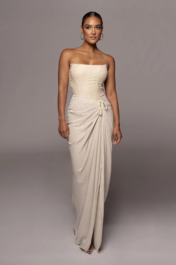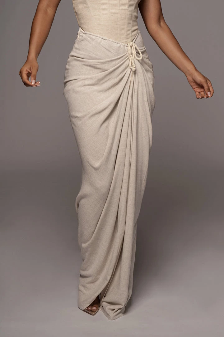 EXCLUSIVELY DESIGNED BY US FOR YOU. Draped to perfection proving life’s better in linen with our NATURAL NOELIA LINEN SLIT SKIRT. Crafted in a fresh linen material, this maxi skirt features a drape design with a stylish rope drawstring and a slit on the side. Hidden side zipper for closure. Pair with our FENIX LINEN CORSET for a full look. No stretch. Single lined.