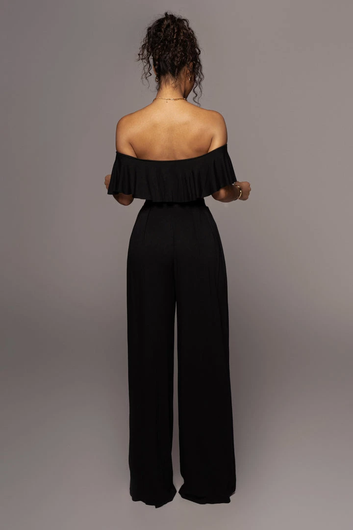 EXCLUSIVELY DESIGNED BY US FOR YOU. Add a touch of flare to your look with the BLACK CLOSE TO YOU SET! Crafted in double lined jersey material, this two piece pant set features a cute crop top with an off the shoulder neckline and trendy ruffle trim. The pant bottoms of the set are topped with an elastic waistband and fall down to classy wide leg hems. Stretchy. Sold as set.