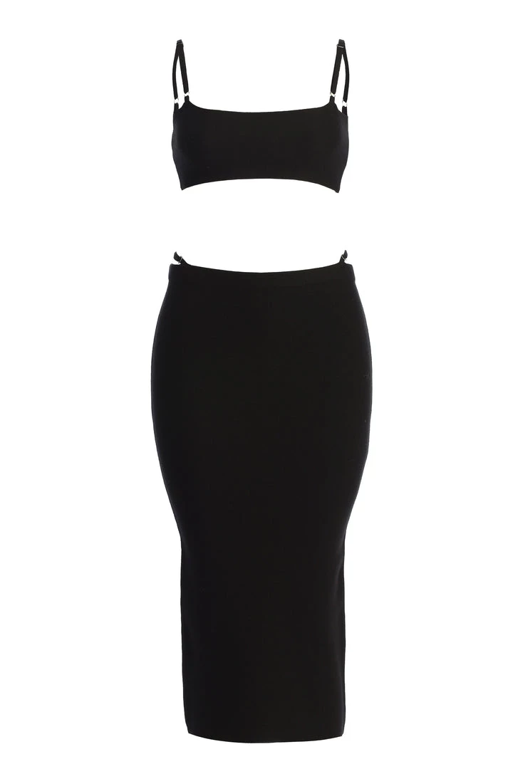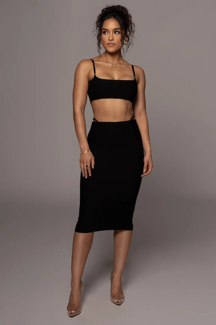 You’ll be breaking hearts this season in our BLACK FINE ROMANCE TWO PIECE SET! This flirty two piece set showcases a bandeau style top with thin adjustable shoulder straps, and a raw cut hem. The skirt to this flattering skirt set comes in a bodycon silhouette and is topped with an elastic waistband and adjustable strap detailing on both sides. Stretchy. Sold as set.